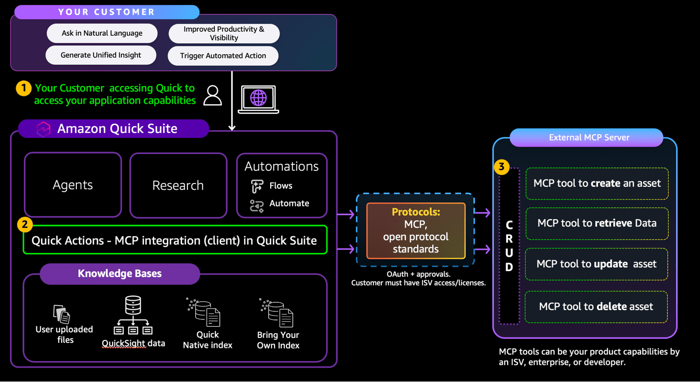 Favorite Amazon Quick supports Model Context Protocol (MCP) integrations for action execution, data access, and AI agent integration. You can expose your application’s capabilities as MCP tools by hosting your own MCP server and configuring an MCP integration in Amazon Quick. Amazon Quick acts as an MCP client and connects to