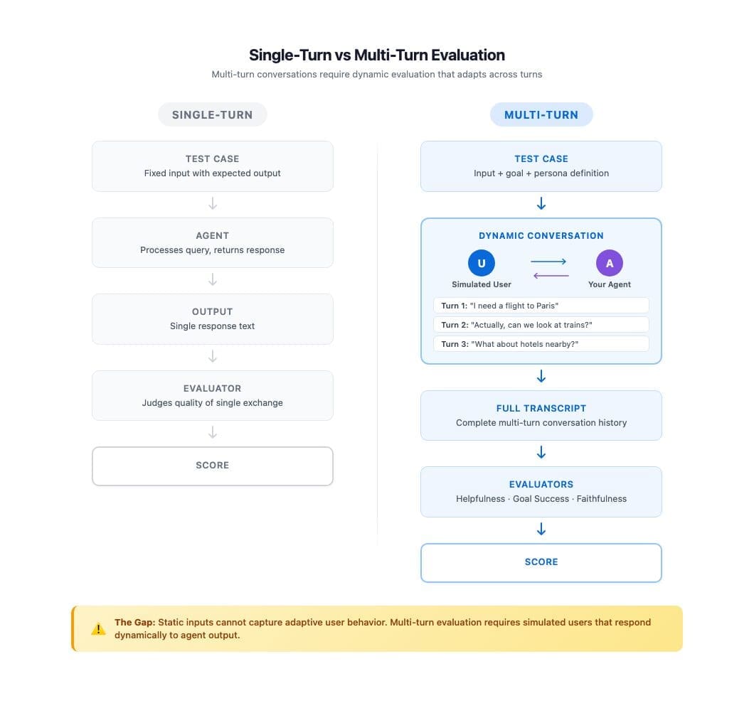 Favorite Evaluating single-turn agent interactions follows a pattern that most teams understand well. You provide an input, collect the output, and judge the result. Frameworks like Strands Evaluation SDK make this process systematic through evaluators that assess helpfulness, faithfulness, and tool usage. In a previous blog post, we covered how