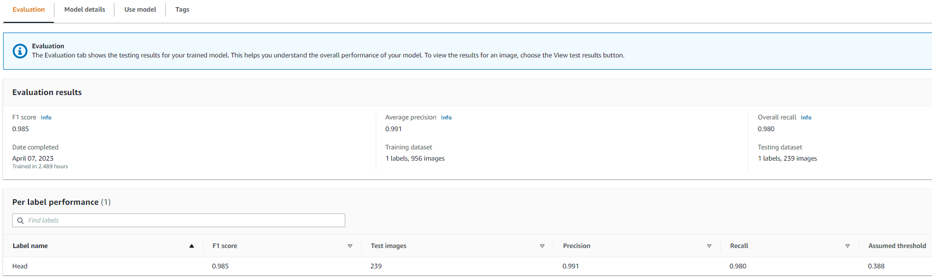 Using the manifest files, we can load datasets to a Rekognition Custom Labels model for training and testing. We iterated the model with different amounts of training data and tested it on the same 239 unseen images. In this test, the mAP_50 score increased from 0.33 with 114 training images to 0.95 with 957 training images. The following screenshot shows the performance metrics of the final Rekognition Custom Labels model, which yields great performance in terms of F1 score, precision, and recall.