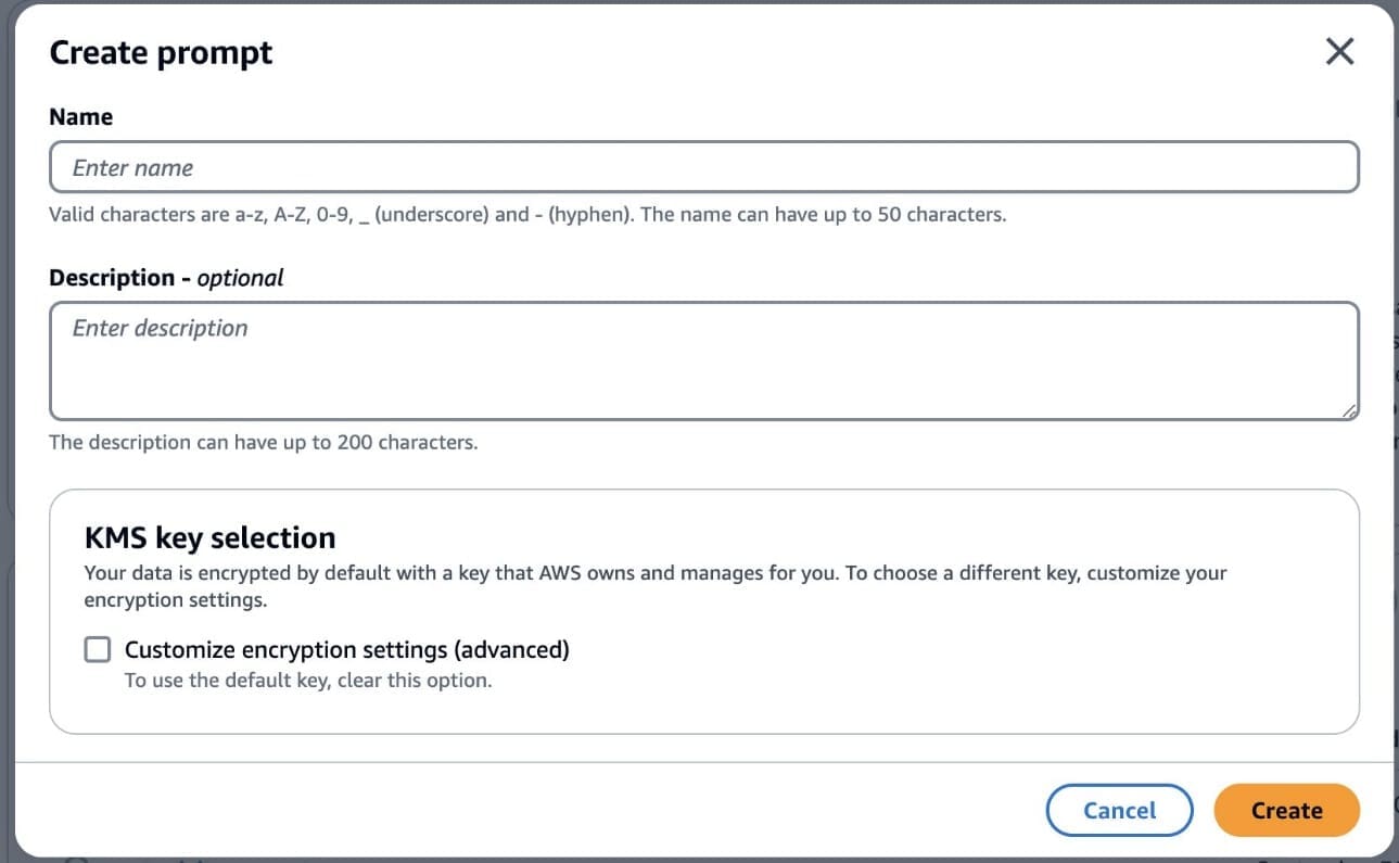 - Enter a name and optional description for your prompt, then choose Create.