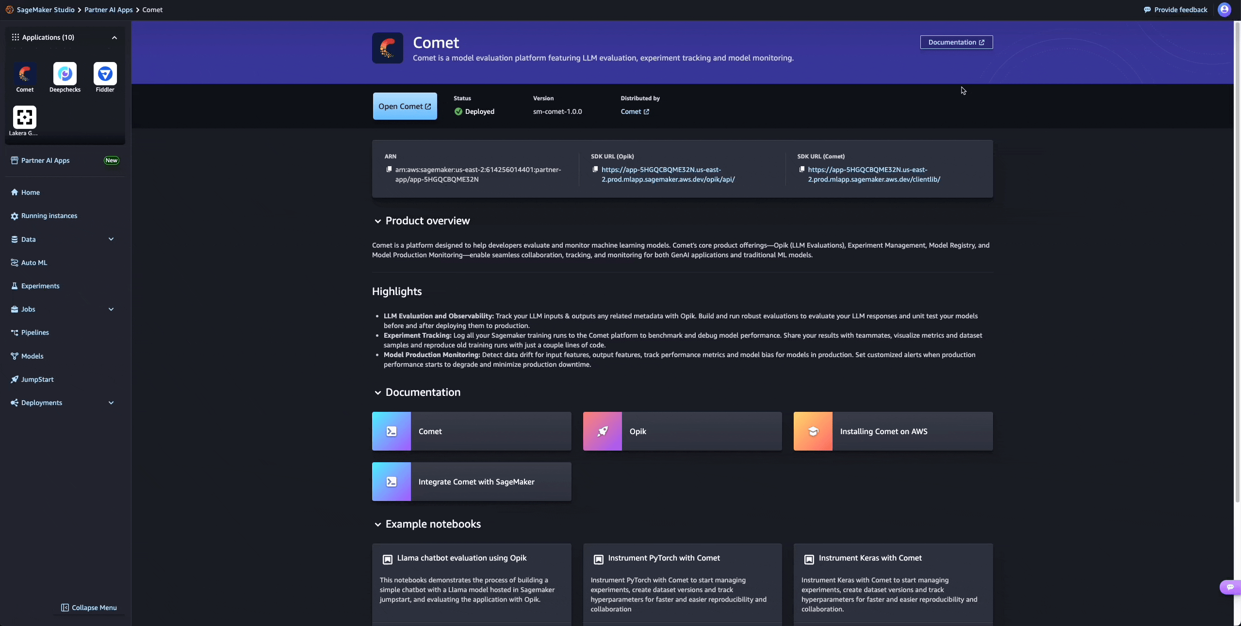 Comet provides an end-to-end model evaluation solution for AI developers with best-in-class tooling for experiment tracking and model production monitoring. Comet has been trusted by enterprise customers and academic teams since 2017. Within SageMaker Studio, Notebooks and Pipelines, data scientists, ML engineers, and AI researchers can use Comet’s robust tracking and monitoring capabilities to oversee model lifecycles from training through production, bringing transparency and reproducibility to ML workflows.