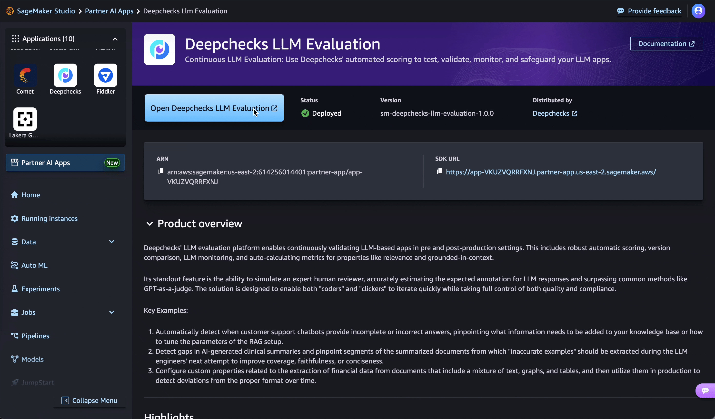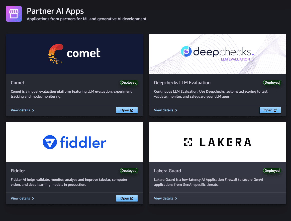 The first group of partners and applications—shown in the following figure—that we’re including are Comet and its model experiment tracking application, Deepchecks and its large language model (LLM) quality and evaluation application, Fiddler and its model observability application, and Lakera and its AI security application.