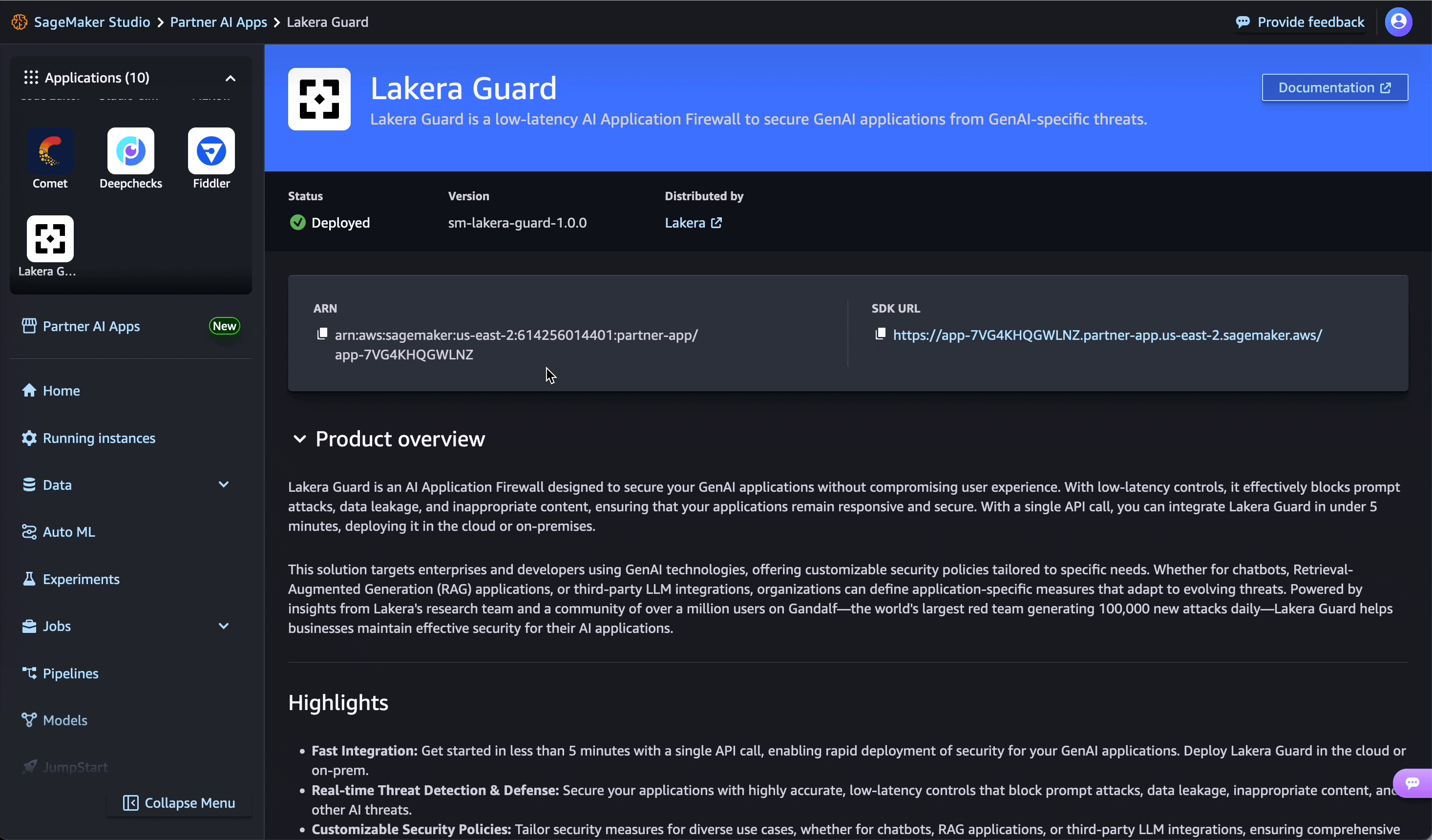 Starting today, you can set up a dedicated instance of Lakera Guard within SageMaker AI that ensures data privacy and delivers low-latency performance, with the flexibility to scale alongside your generative AI application’s evolving needs. To learn more, visit Lakera.