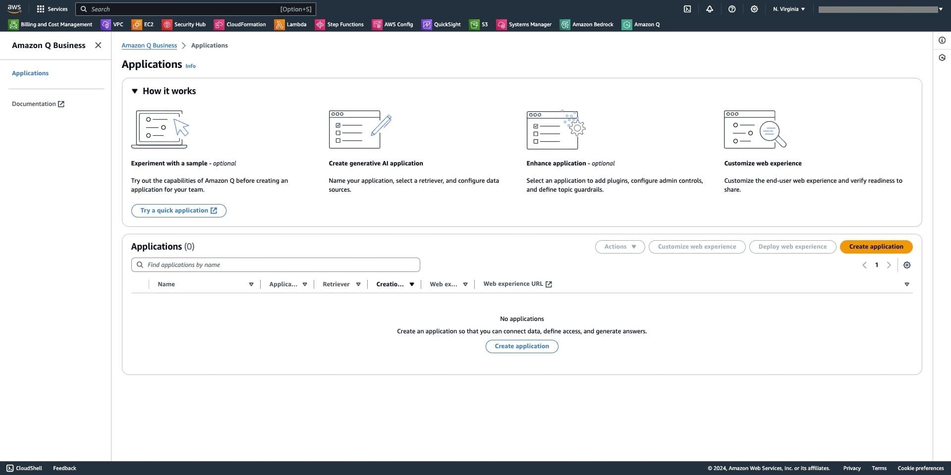 - In the Amazon Q Business console, select Applications in the navigation pane