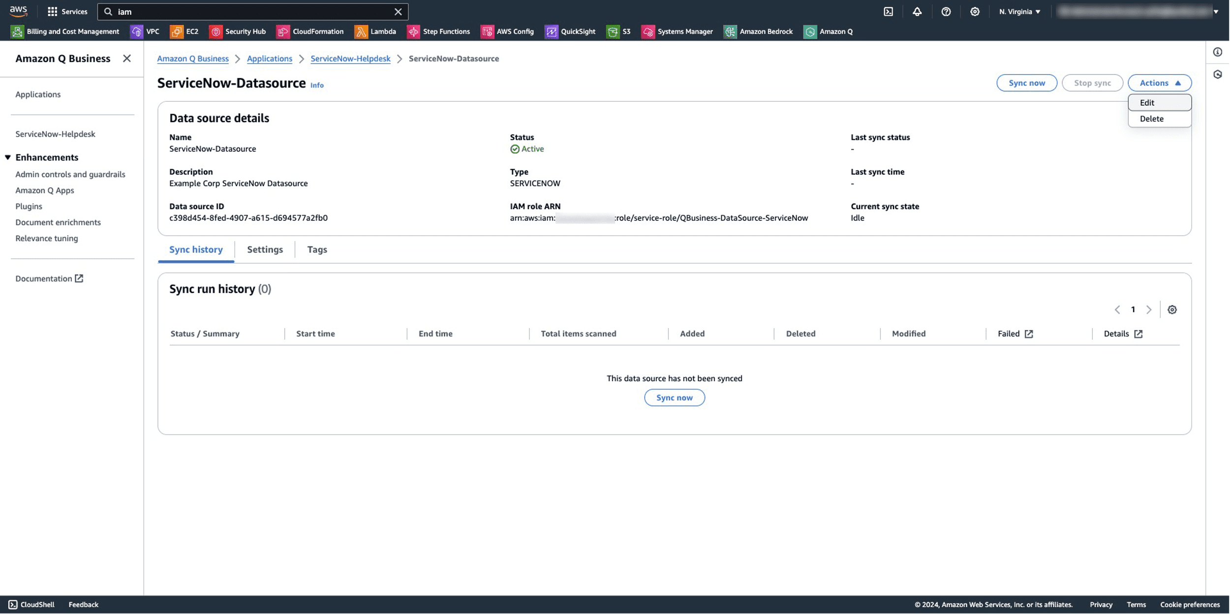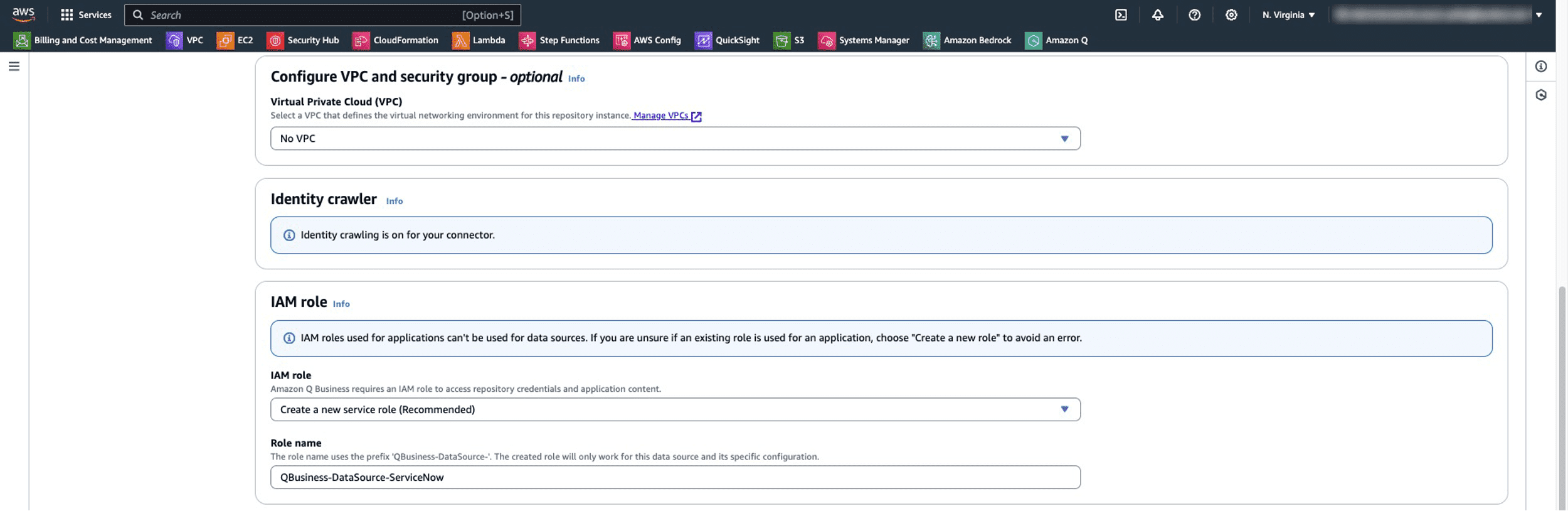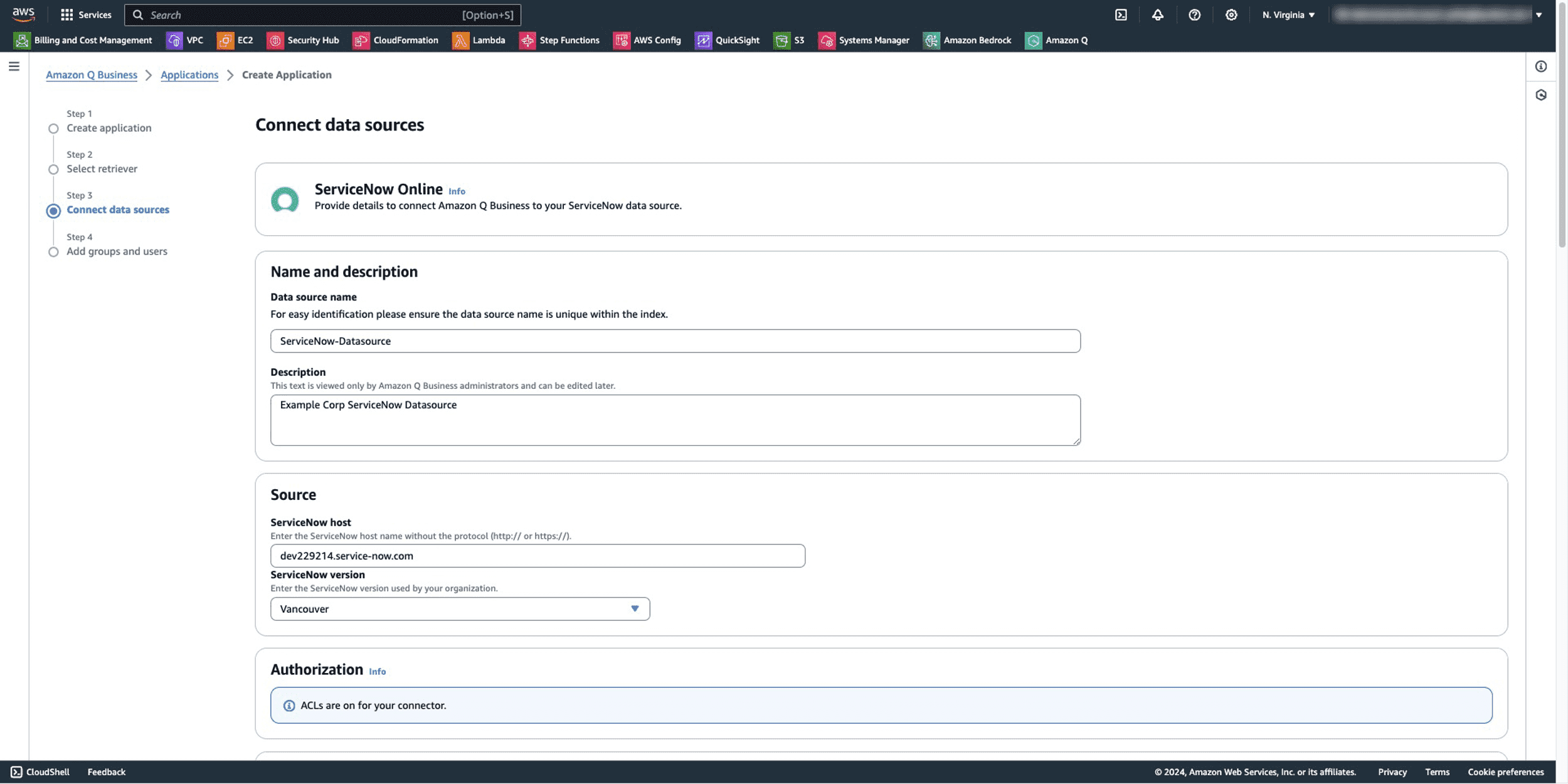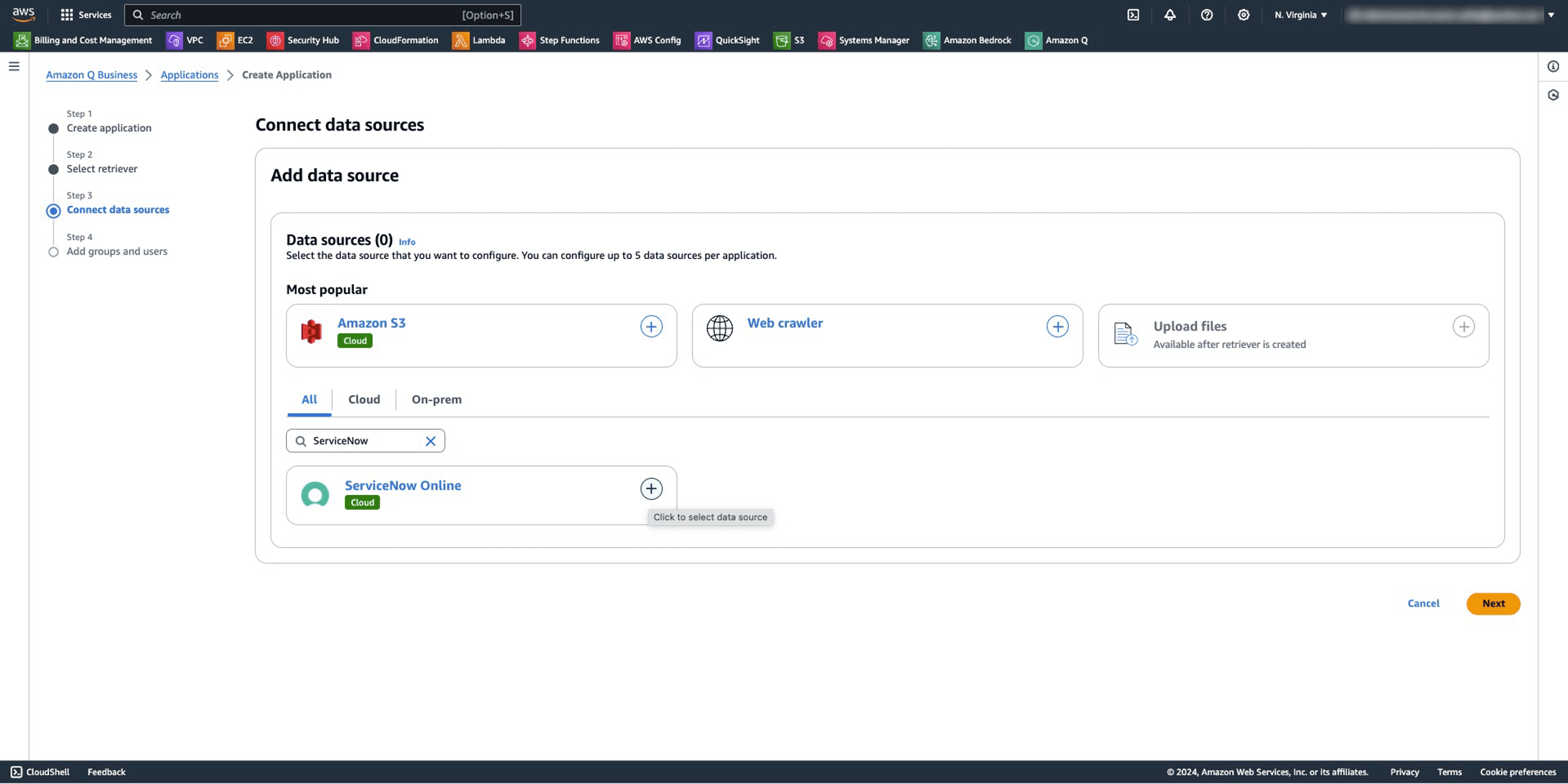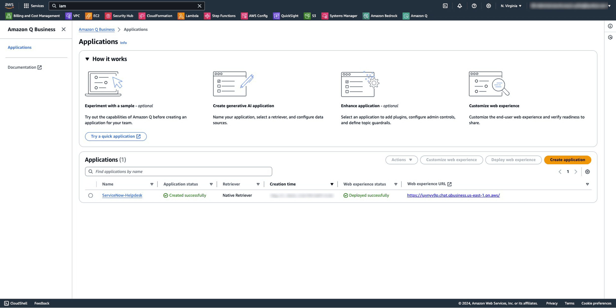 - Create an Amazon Q Business application and configure the ServiceNow data source and retriever in Amazon Q Business