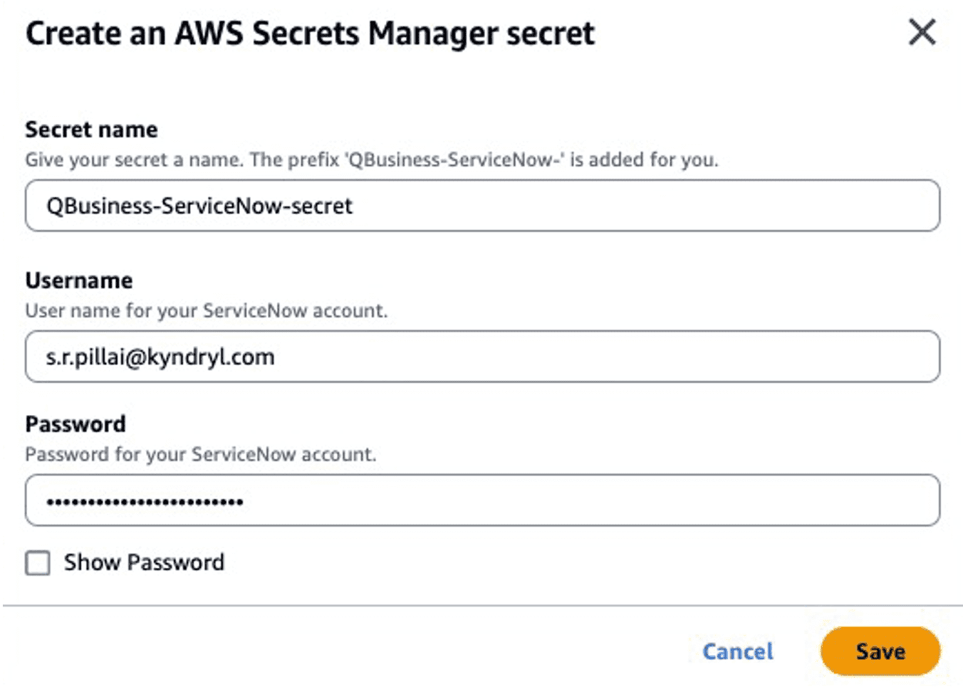 - Provide the Username and Password you created in ServiceNow to create an AWS Secrets Manager secret. Choose Save.