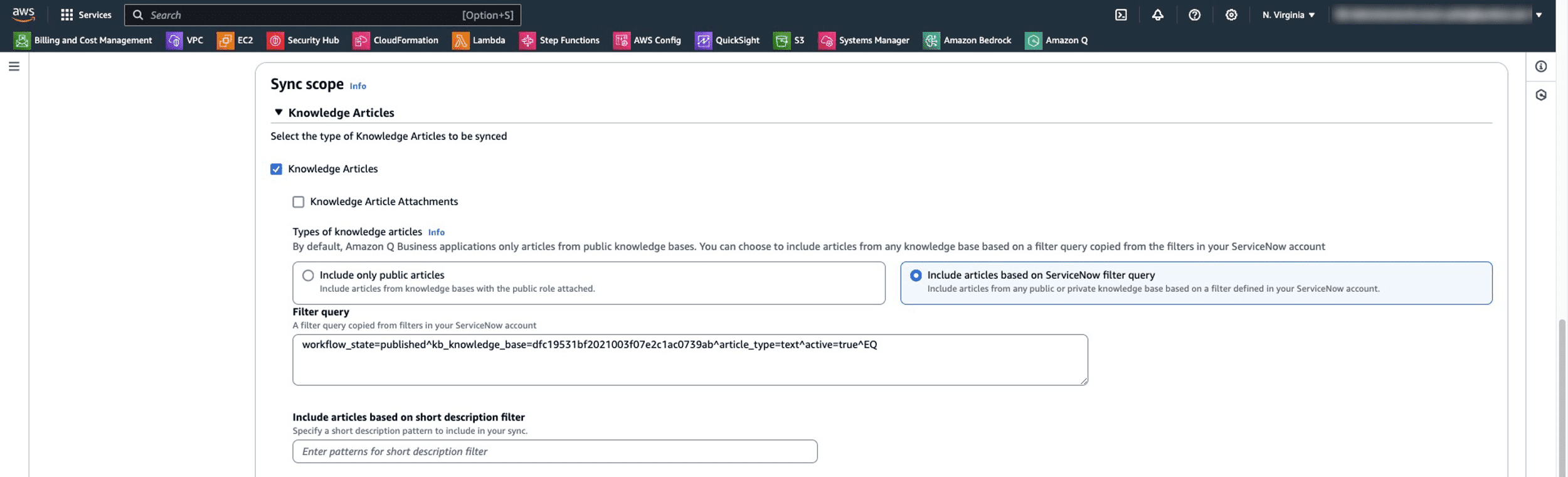 The filter fields are separated by ^, and the end of the query is represented by EQ. You can find more details about the Filter query and other parameters in Connecting Amazon Q Business to ServiceNow Online using the console.