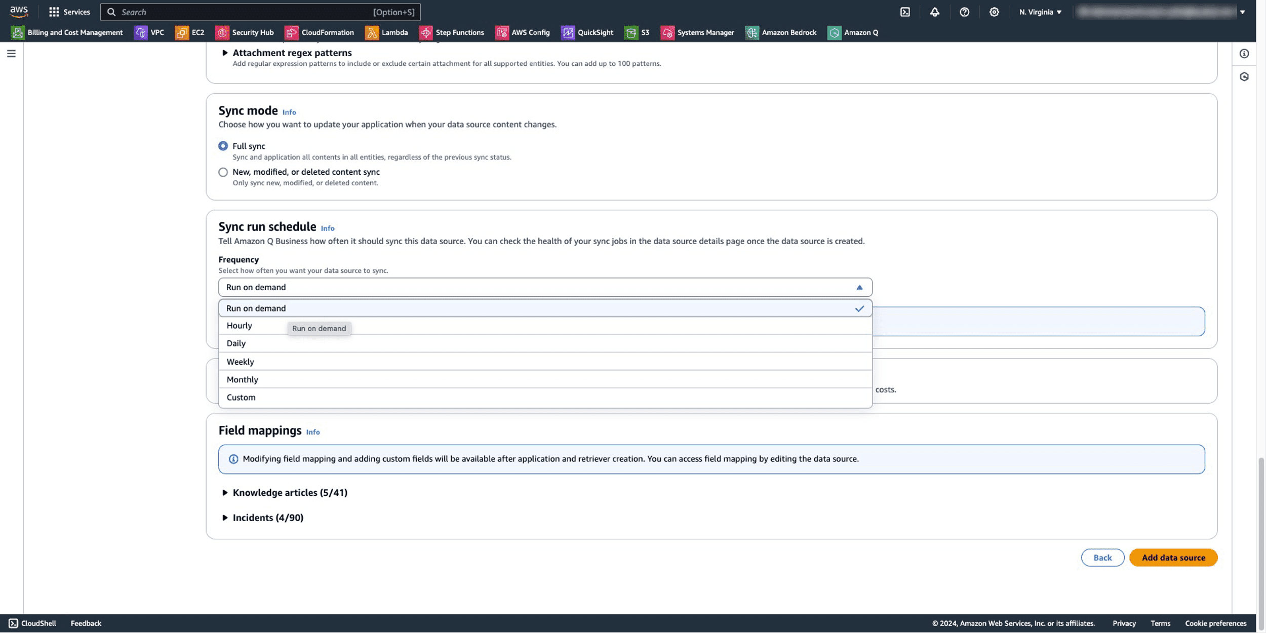 - You may select Full sync initially so that a complete synchronization is performed. You need to select the frequency of the synchronization as well. For this post, we chose Run on demand. If you need to keep the knowledge base and incident data more up-to-date with the ServiceNow instance, choose a shorter window.