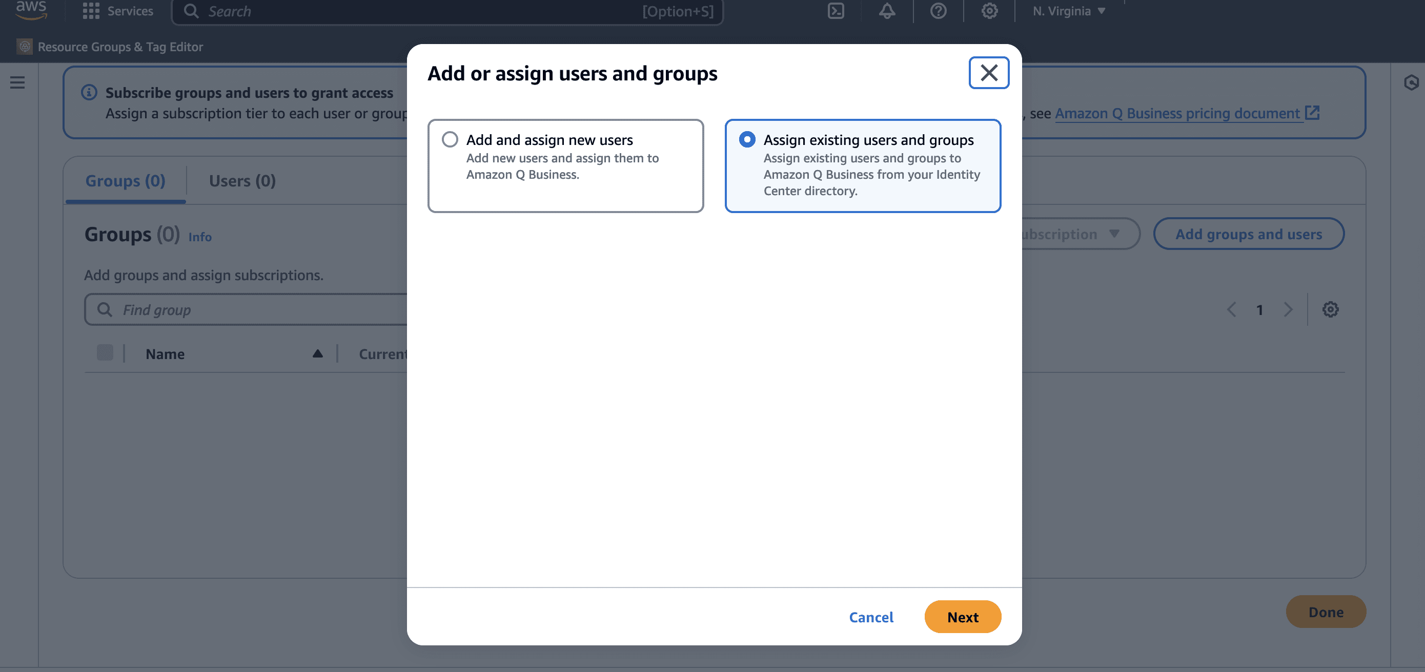 - Search for an existing user or group in your IAM Identity Center, select one, and choose Assign. After selecting the right user or group, choose Done.