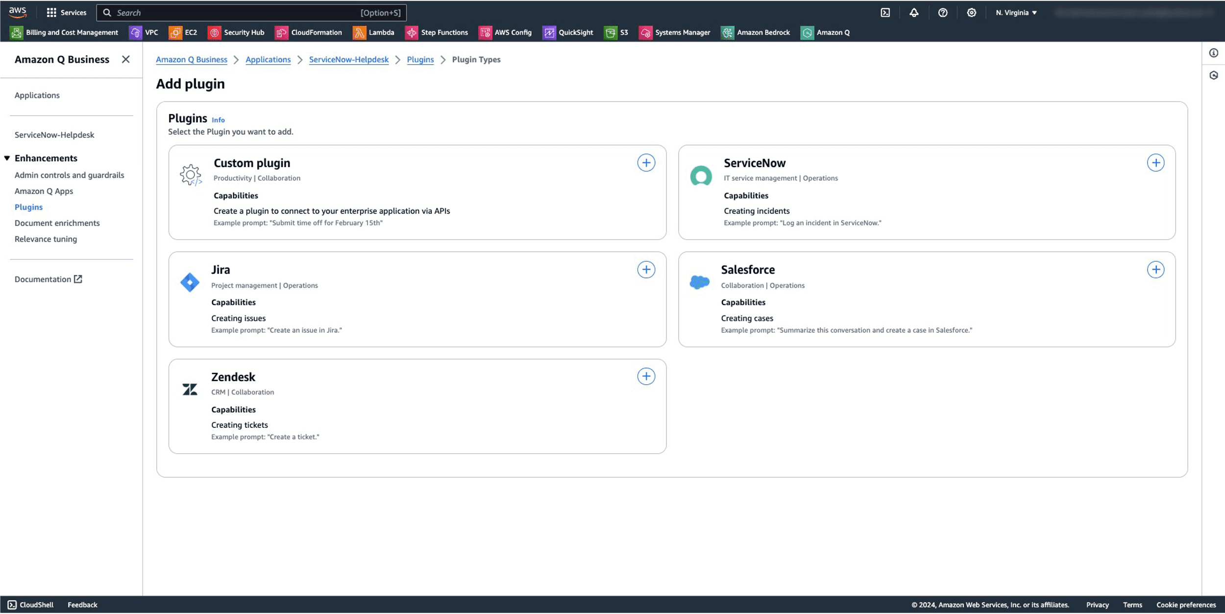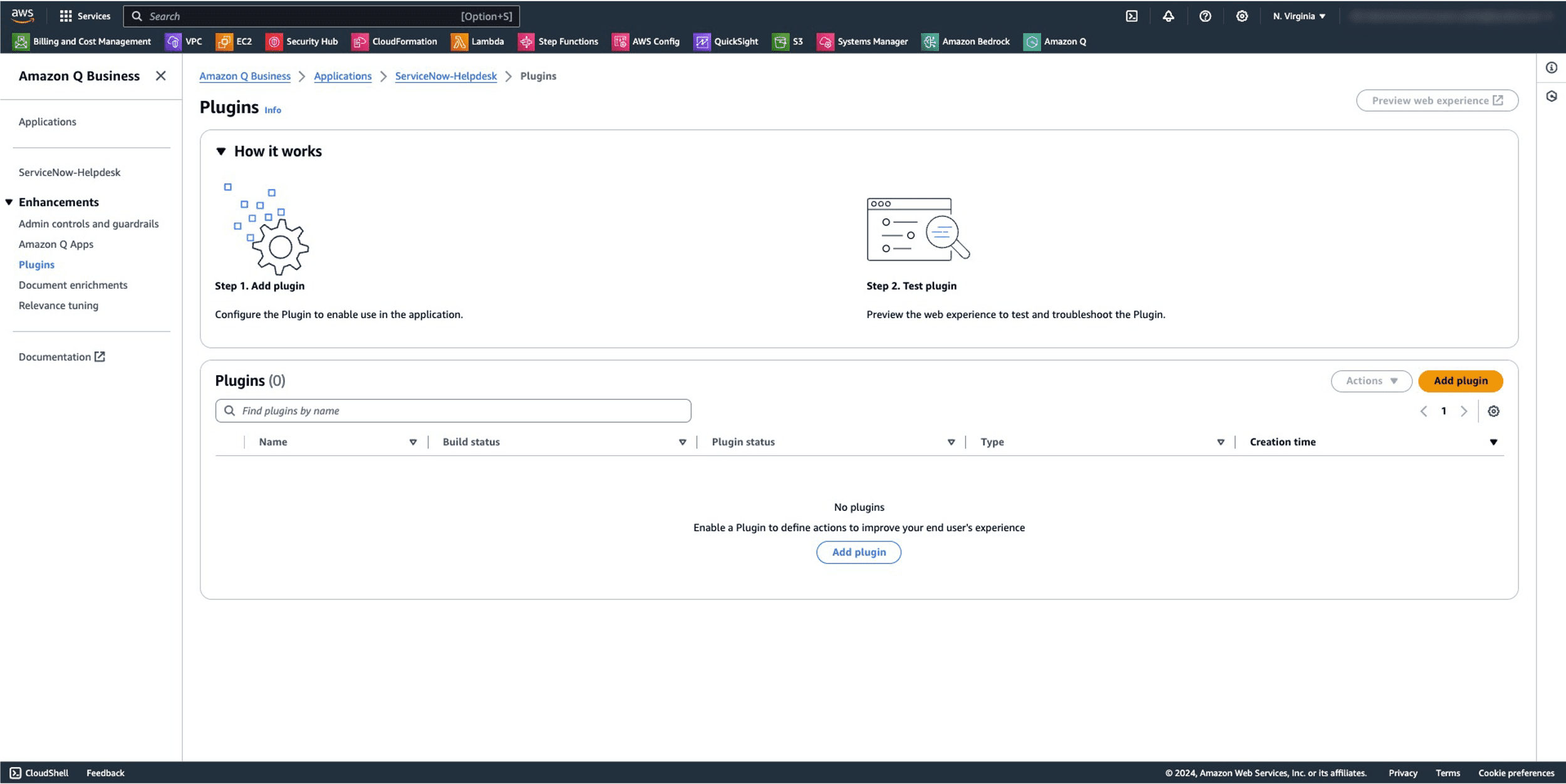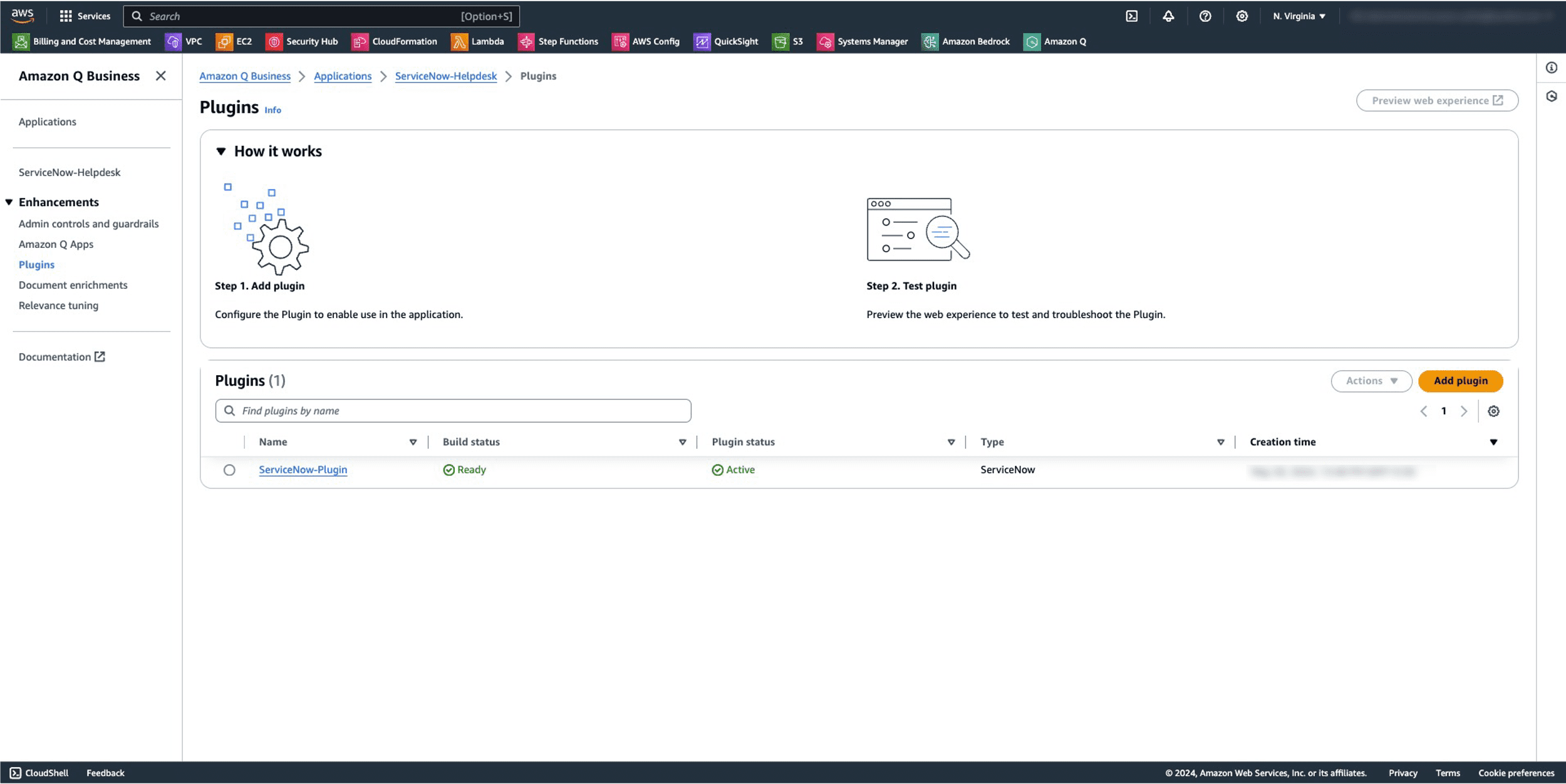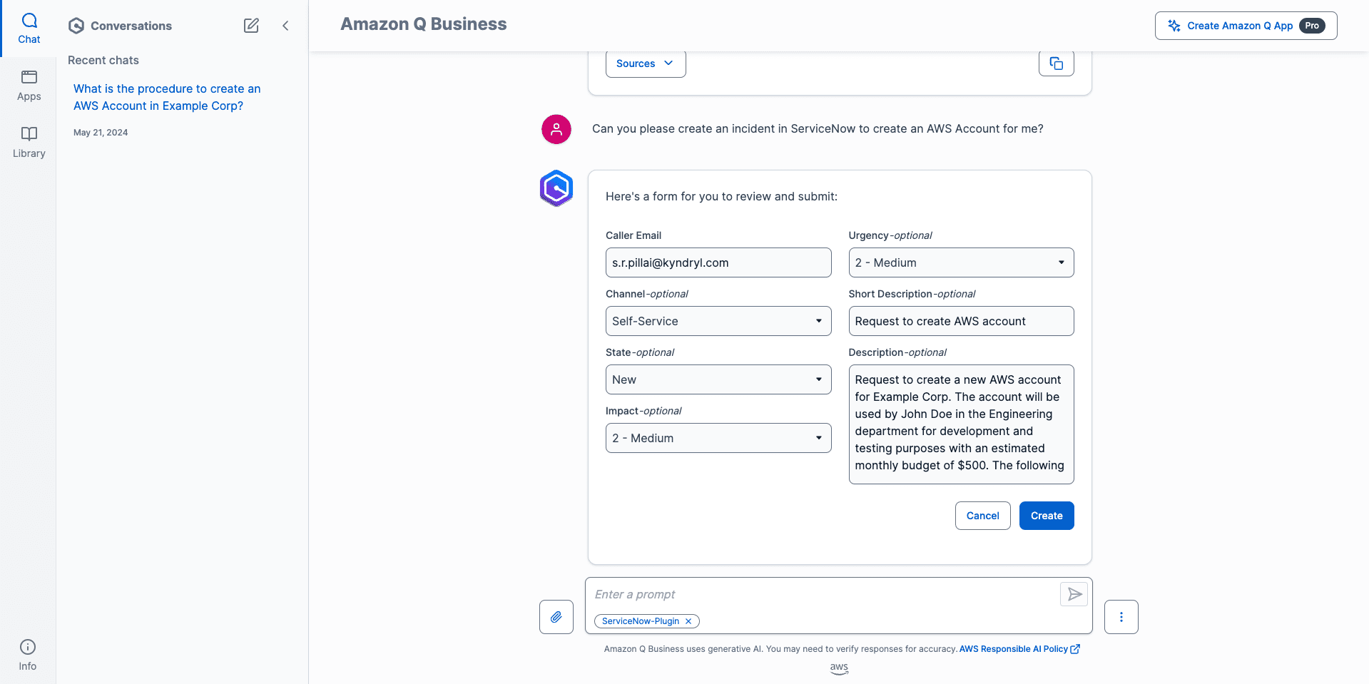 A ServiceNow plugin in Amazon Q Business helps you create incidents in ServiceNow through Amazon Q Business chat. To create one, follow these steps:
