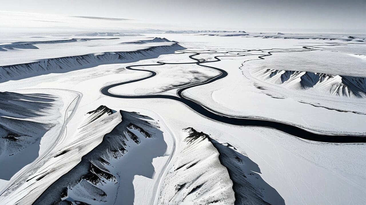 Aerial view of sparse arctic tundra landscape, expansive white terrain with meandering frozen rivers and scattered rock formations. High-contrast black and white composition showcasing intricate patterns of ice and snow, emphasizing texture and geological diversity. Bird’s-eye perspective capturing the abstract beauty of the arctic wilderness. An overhead shot of premium over-ear headphones resting on a reflective surface, showcasing the symmetry of the design. Dramatic side lighting accentuates the curves and edges, casting subtle shadows that highlight the product’s premium build quality