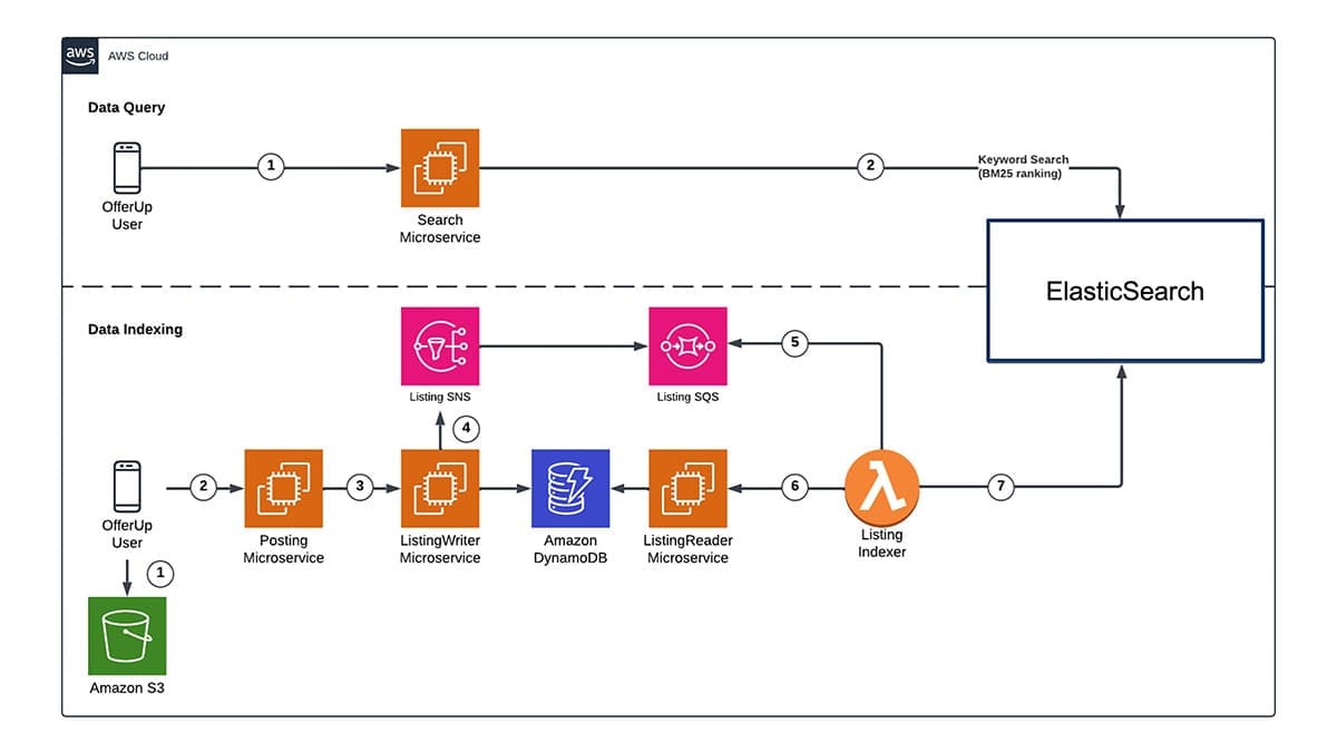OfferUp hosts millions of active listings, with millions more added monthly by its users. Previously, OfferUp’s search engine was built with Elasticsearch (v7.10) on Amazon Elastic Compute Cloud (Amazon EC2), using a keyword search algorithm to find relevant listings. The following diagram illustrates the data pipeline for indexing and query in the foundational search architecture.