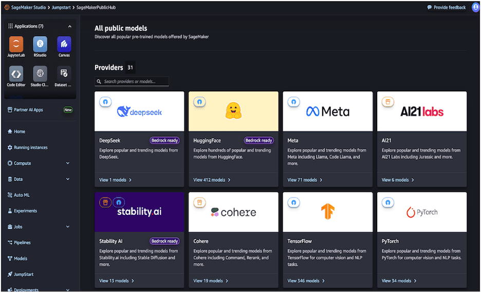 - Amazon SageMaker JumpStart offers a diverse selection of open and proprietary FMs from providers like Hugging Face, Meta, and Stability AI. You can deploy or fine-tune models through an intuitive UI or APIs, providing flexibility for all skill levels.