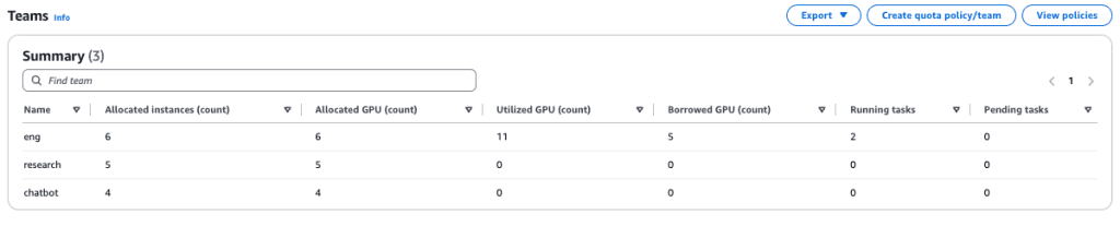 • List compute quota allocations with the AWS CLI – This AWS CLI command is useful to view the different teams and set up task governance and their respective quota allocation settings.
