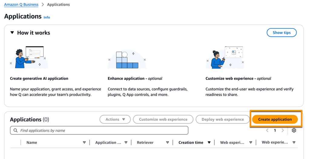 - On the Amazon Q Business console, choose Applications in the navigation pane.