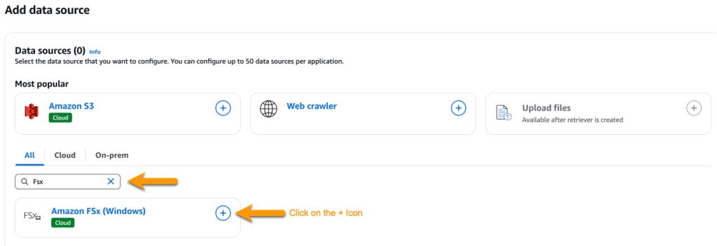 - Search for Amazon FSx and choose the plus sign next to Amazon FSX (Windows).
