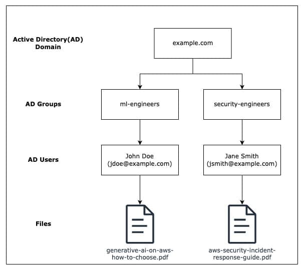 For this post, we have two active directory groups, ml-engineers and security-engineers. Each group has one user under them (John Doe and Jane Smith), and they have access to only one whitepaper based on their group (Choosing a generative AI service and AWS Security Incident Response Guide, respectively). The following diagram illustrates this access.