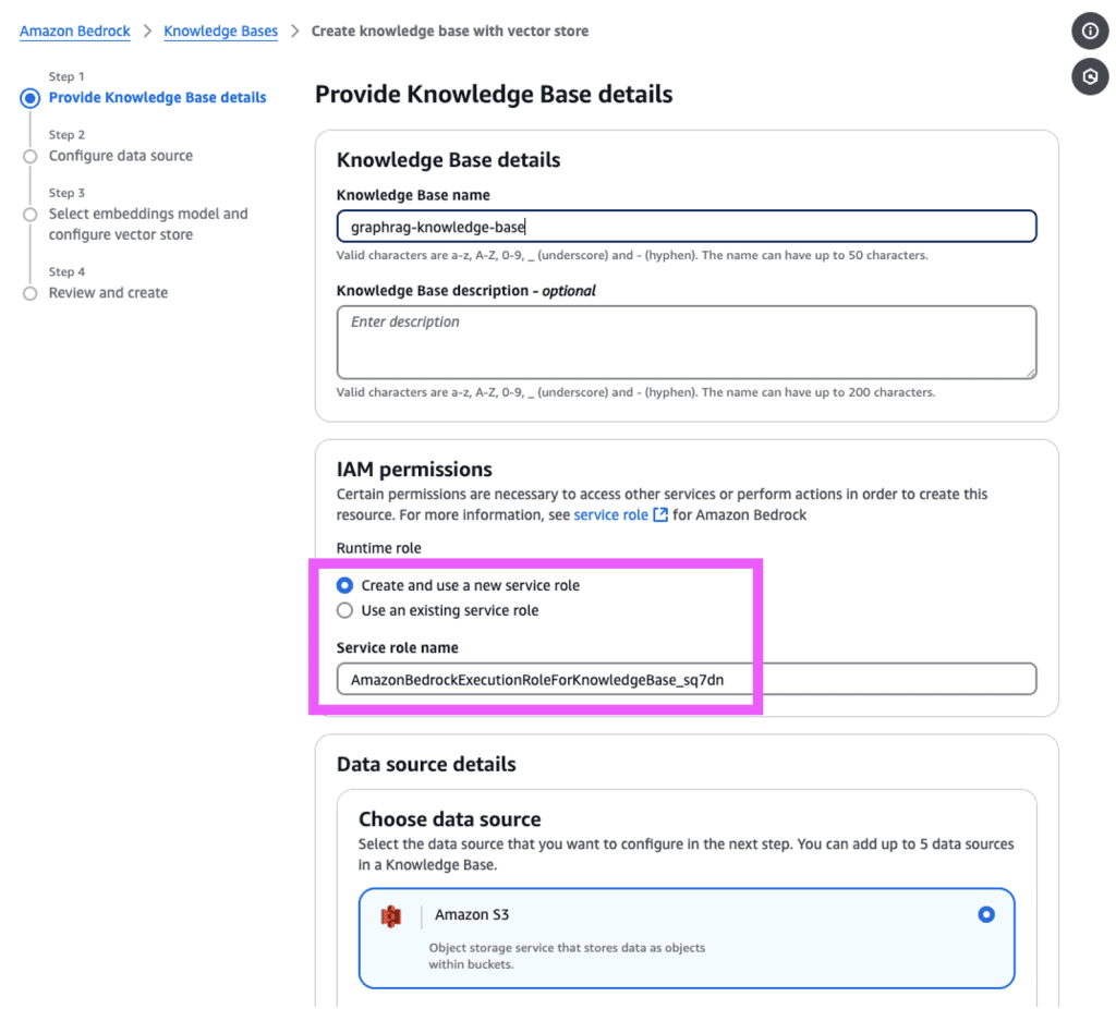 4. For IAM permissions, select Create and use a new service role to create a new AWS Identity and Access Management (IAM) role.