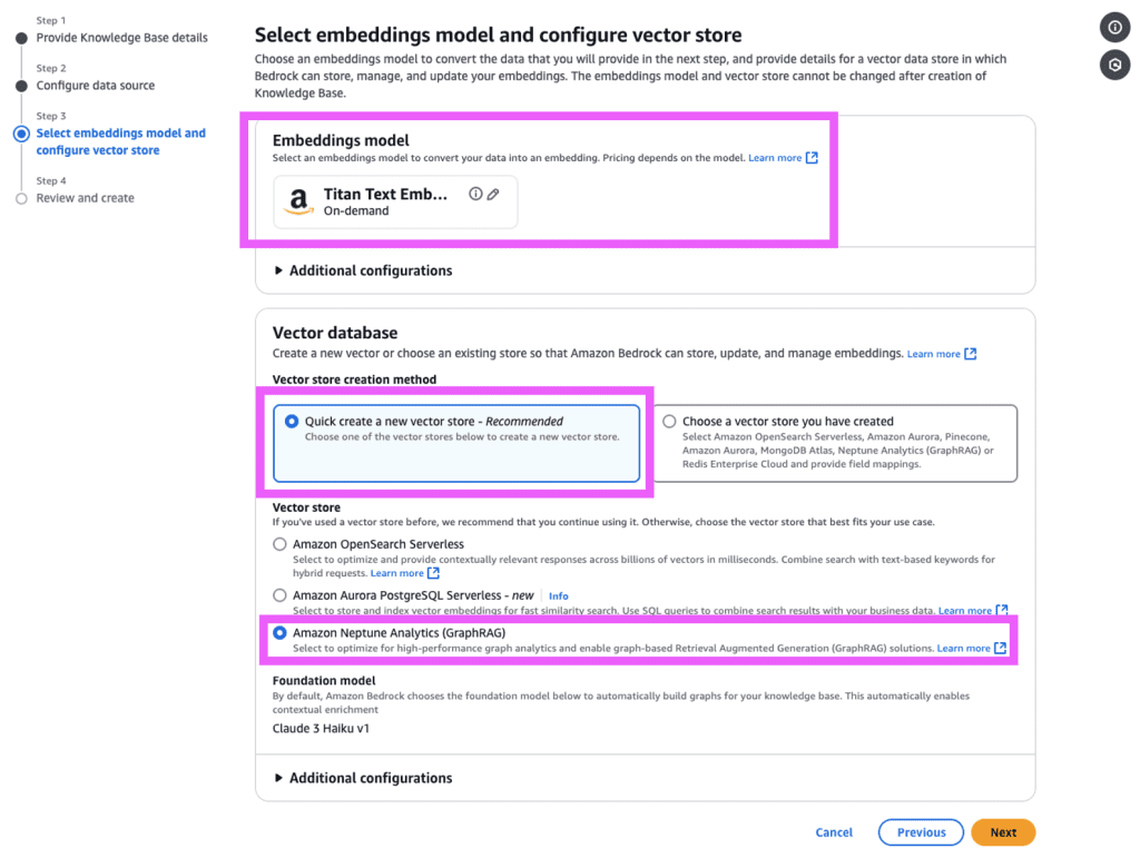 12. For Vector database, select Quick create a new vector store and then select Amazon Neptune Analytics (GraphRAG).