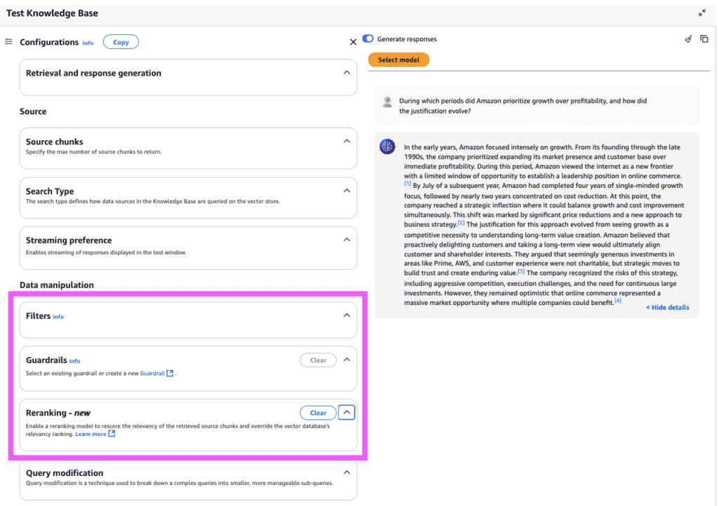 3. We encourage you to enable reranking (For information about pricing for reranking models, see Amazon Bedrock Pricing) to fully take advantage of the capabilities of GraphRAG. Reranking allows GraphRAG to refine and optimize search results.