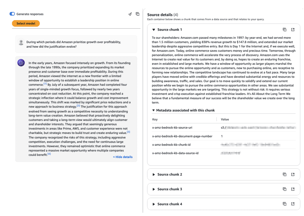 5. Use the chat area in the right pane to ask questions about the documents from your Amazon S3 bucket.