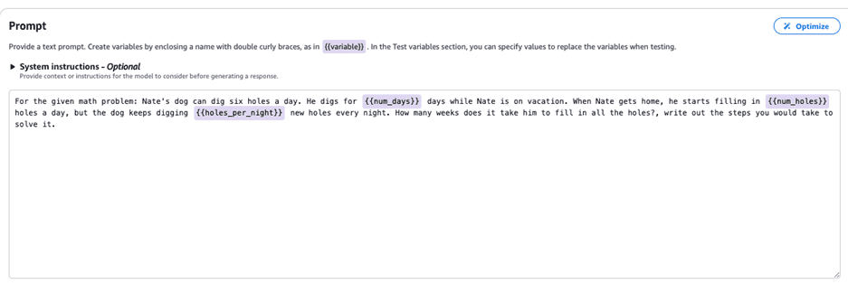 To get started with prompt optimization, select DeepSeek-R1 on the model playground on Amazon Bedrock, enter your prompt, and choose the magic wand icon, or use the Amazon Bedrock optimize_prompt() API. You may also use prompt optimization on the console, add variables if required, set your model to Deepseek-R1 and model parameters, and click “Optimize”: