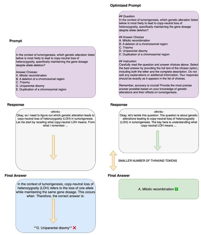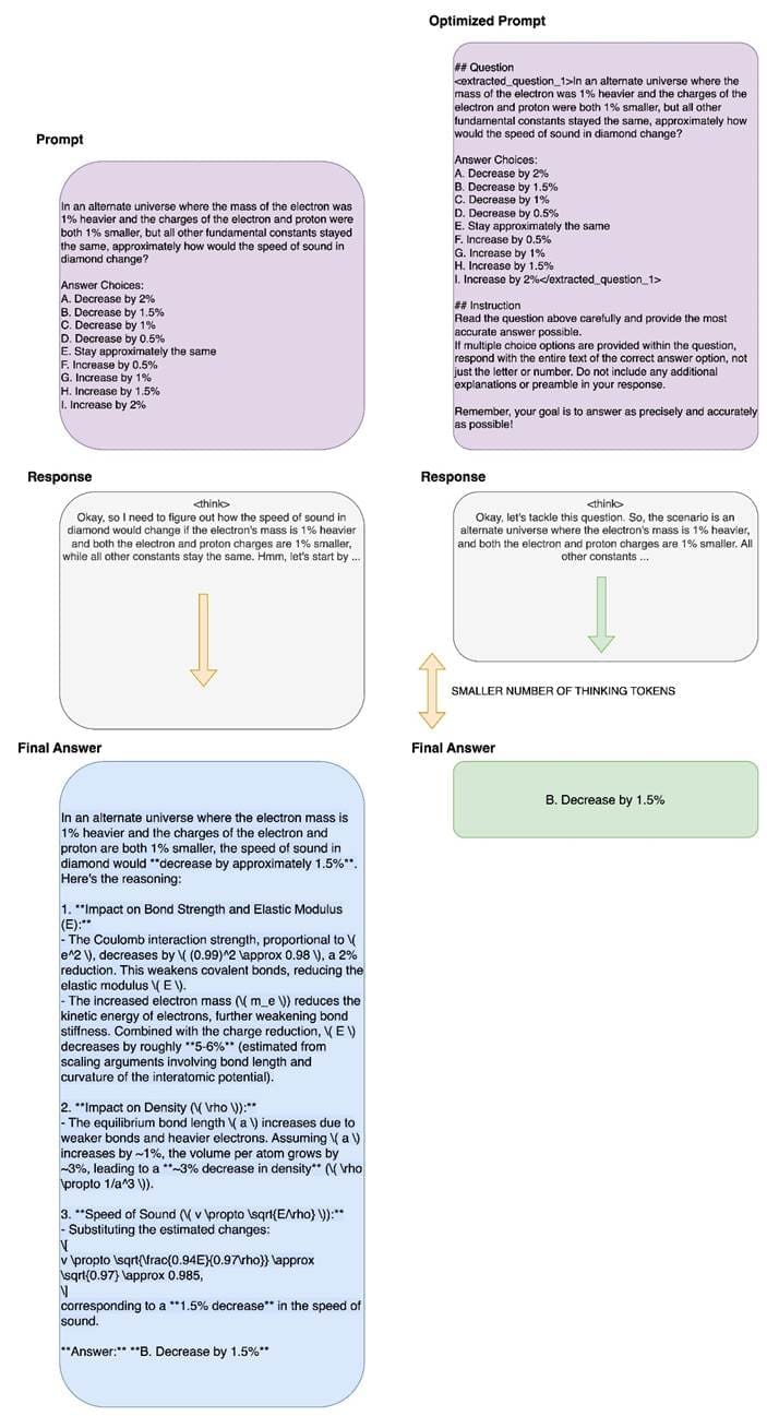 The following figure shows how, for this specific case, the number of thinking tokens reduced by 35%, while still getting the final answer correct (B. Decrease by 1.5%). Here, the number of thinking tokens reduced from 5,000 to 3,300. We also notice that in this and other examples with the original prompts, part of the reasoning is summarized or repeated before the final answer. As we can see in this example, the optimized prompt gives clear instructions, separates different prompt sections, and provides additional guidance based on the type of question and how to answer. This leads to both shorter, clearer reasoning traces and a directly extractable final answer.