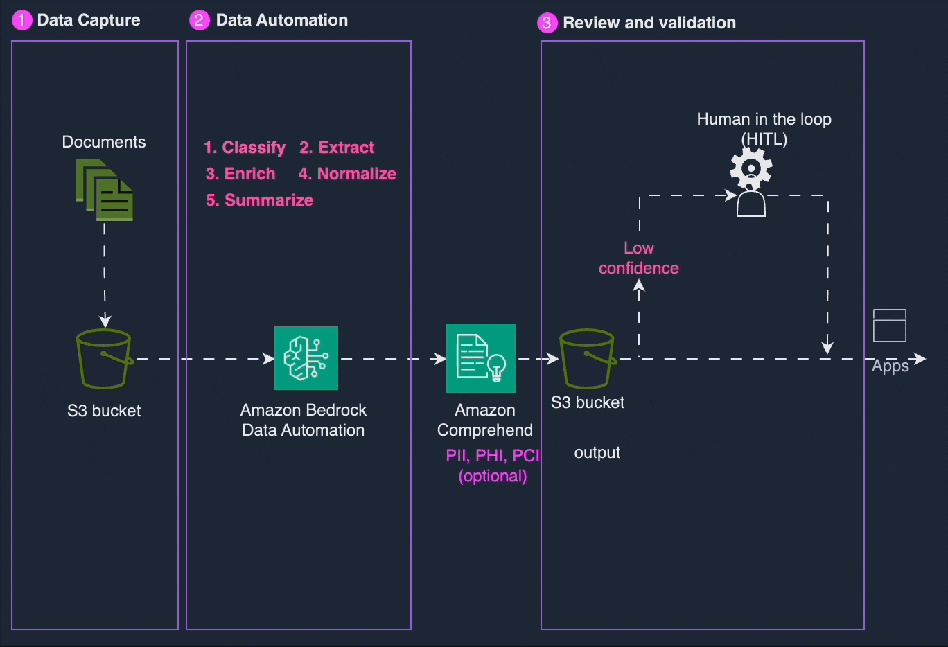 This is achieved through responsible AI, with Amazon Bedrock Data Automation passing every process through a responsible AI model to help ensure fairness, accuracy, and compliance in document automation.