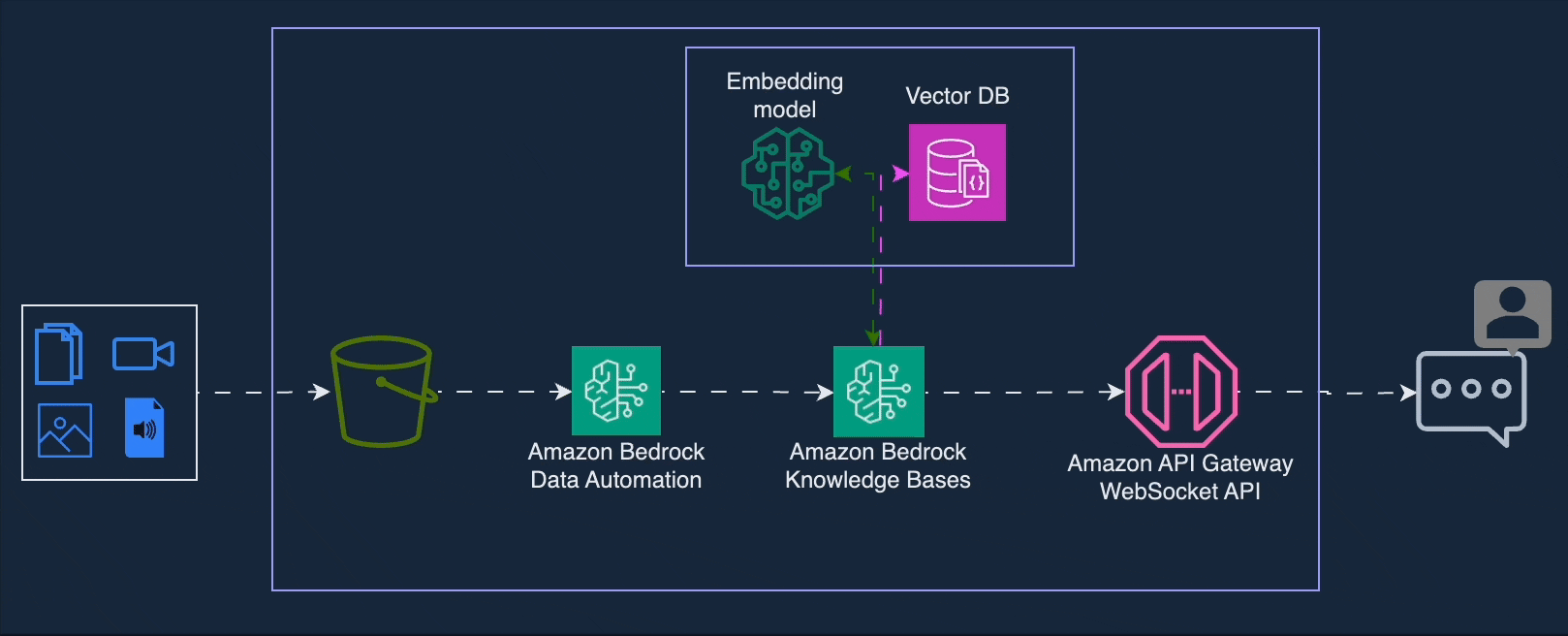 The preceding architecture diagram showcases a pipeline for processing and retrieving insights from multimodal content using Amazon Bedrock Data Automation and Amazon Bedrock Knowledge Bases. Unstructured data, such as documents, images, videos, and audio, is first ingested into an Amazon S3 bucket. Amazon Bedrock Data Automation then processes this content, extracting key insights and transforming it for further use. The processed data is stored in Amazon Bedrock Knowledge Bases, where an embedding model converts it into vector representations, which are then stored in a vector database for efficient semantic search. Amazon API Gateway (WebSocket API) facilitates real-time interactions, enabling users to query the knowledge base dynamically via a chatbot or other interfaces. This architecture enhances automated data processing, efficient retrieval, and seamless real-time access to insights.