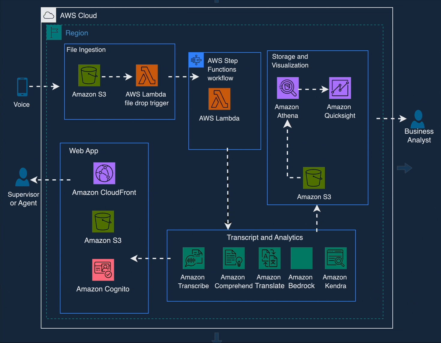 6. Audio metadata extraction: Extraction of file properties such as format, duration, and bit rate is handled by either Amazon Transcribe Analytics or another call center solution.