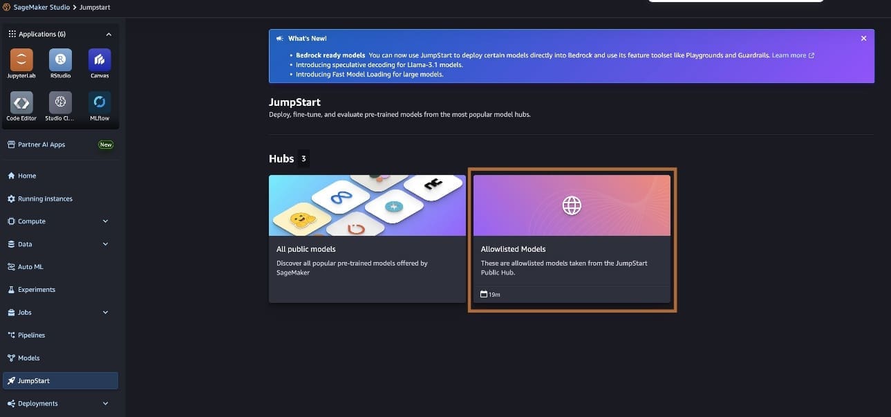 Today, we are announcing an enhanced private hub feature with several new capabilities that give organizations greater control over their ML assets. These enhancements include the ability to fine-tune SageMaker JumpStart models directly within the private hub, support for adding and managing custom-trained models, deep linking capabilities for associated notebooks, and improved model version management. These new features streamline the ML workflow by combining the convenience of pre-built solutions with the flexibility of custom development, while maintaining enterprise-grade security and governance.