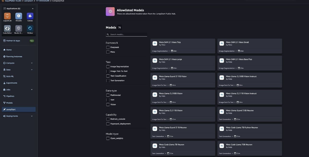 - Support for custom models – In addition to the pre-trained SageMaker JumpStart models, administrators can now add their own custom-trained models to the private hub and fine-tune them as needed.