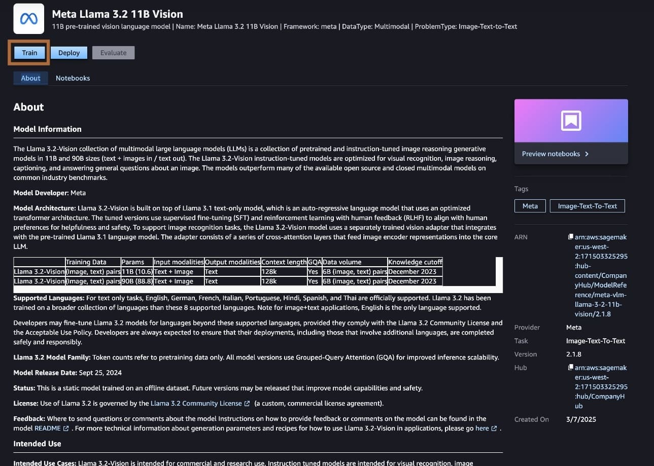 - To fine-tune a model, choose Train (this option will be enabled if it’s supported).