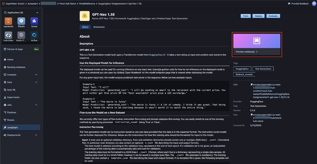 - Choose your model, then choose Preview notebooks.