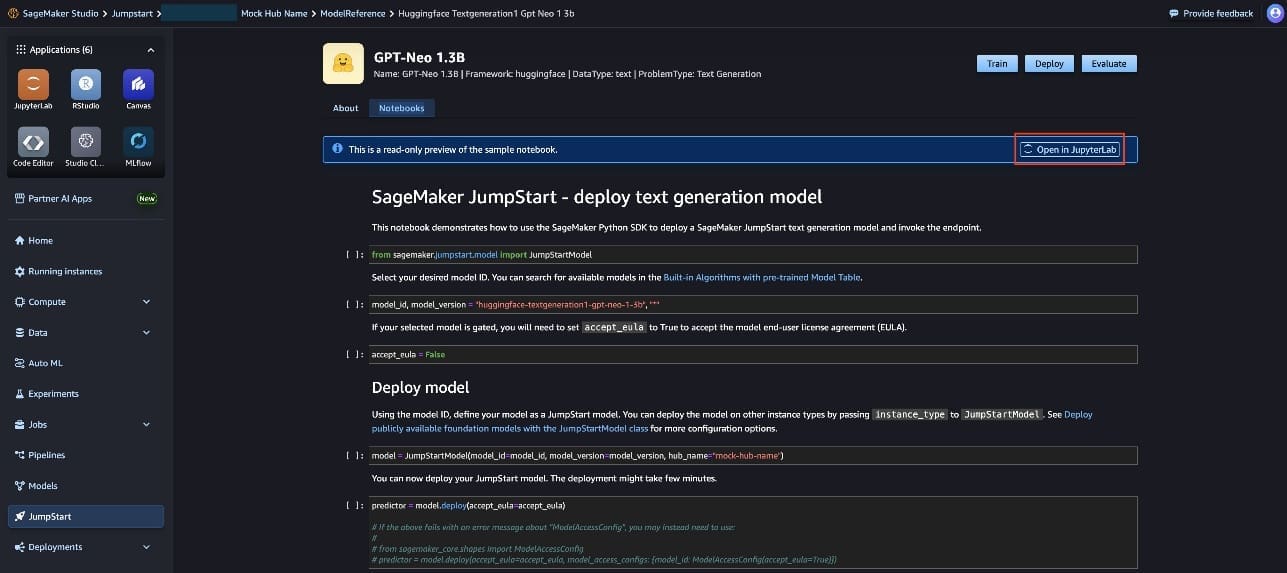 - Choose Open in JupyterLab to start the deep link workflow.