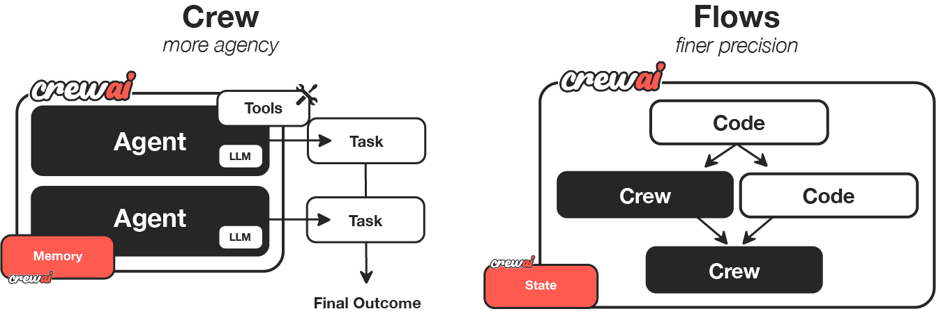At a high level, CrewAI creates two main ways to create agentic automations: flows and crews.