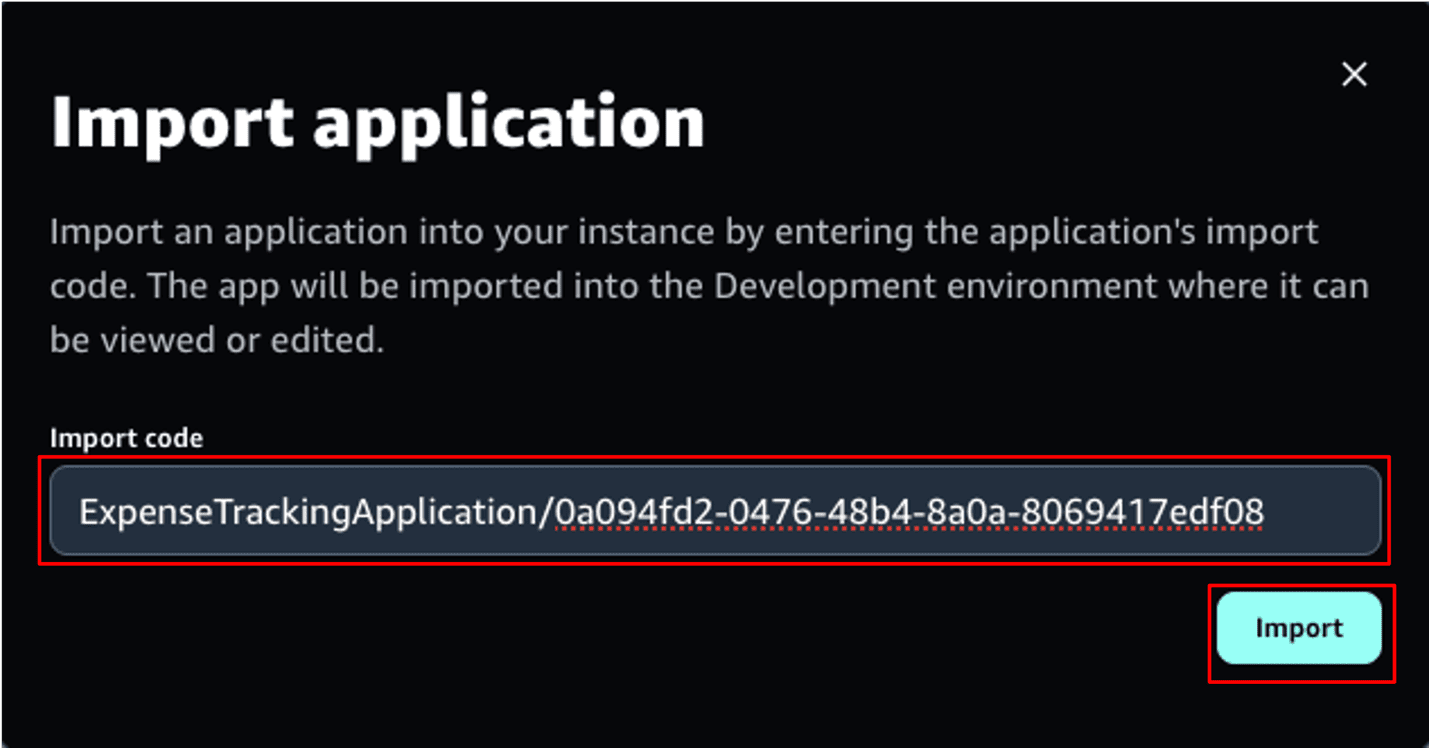 - Enter an import code from the prebuilt app catalog or that you generated by the export process outlined in the next section and choose Import. Depending on the application size, you might need to wait a few seconds for the import to finish.