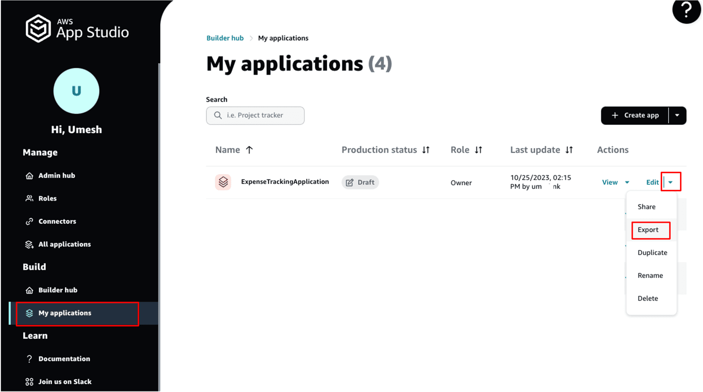 Now that we have successfully imported an application, let’s walk through how we can export our own applications to a different App Studio instance.