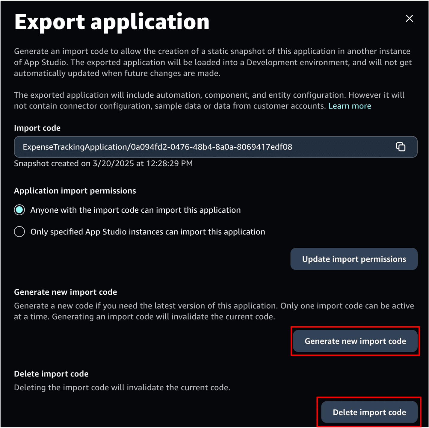 - Generate new import code – When you make updates to this application, you will need to generate a new import code by choosing Generate new code. Generating a new code invalidates the old code, but will not automatically refresh existing imported applications.