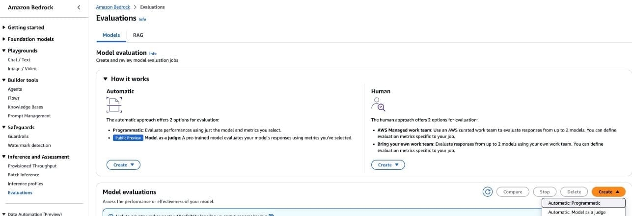 - On the Amazon Bedrock console, under Inference and Assessments in the navigation pane, choose Evaluations.