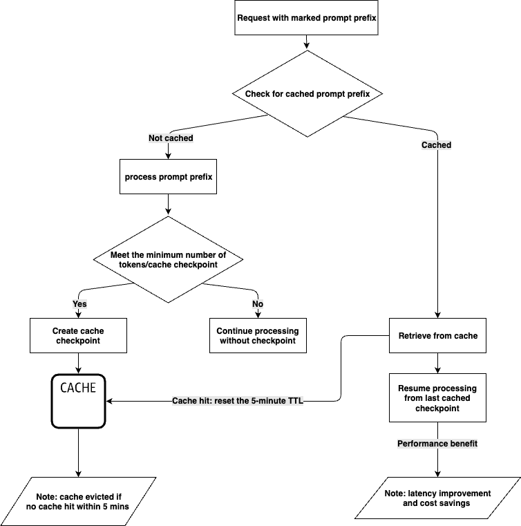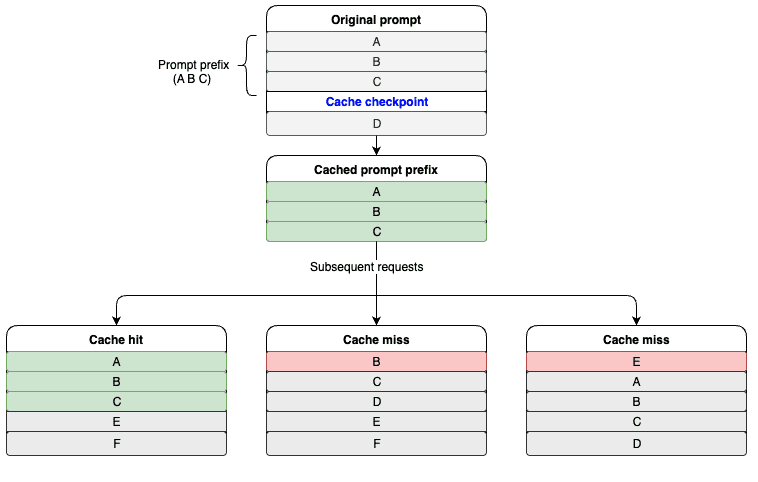 You can begin by marking the relevant portions of your prompt with cache checkpoints. The entire section of the prompt preceding the checkpoint then becomes the cached prompt prefix. As you send more requests with the same prompt prefix, marked by the cache checkpoint, the LLM will check if the prompt prefix is already stored in the cache. If a matching prefix is found, the LLM can read from the cache, allowing the input processing to resume from the last cached prefix. This saves the time and cost that would otherwise be spent recomputing the prompt prefix.