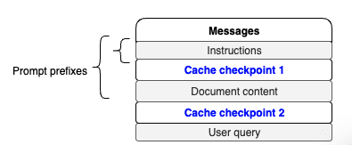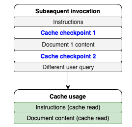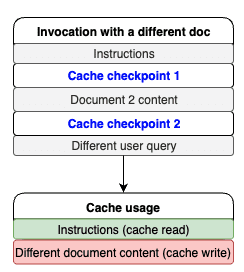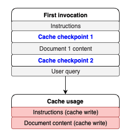 In this scenario, the static portions of the prompt should be marked as the prompt prefixes to enable prompt caching. The following code snippet demonstrates how to implement this approach using the Invoke Model API. Here we create two cache checkpoints in the request, one for the instructions and one for the document content, as illustrated in the following figure.