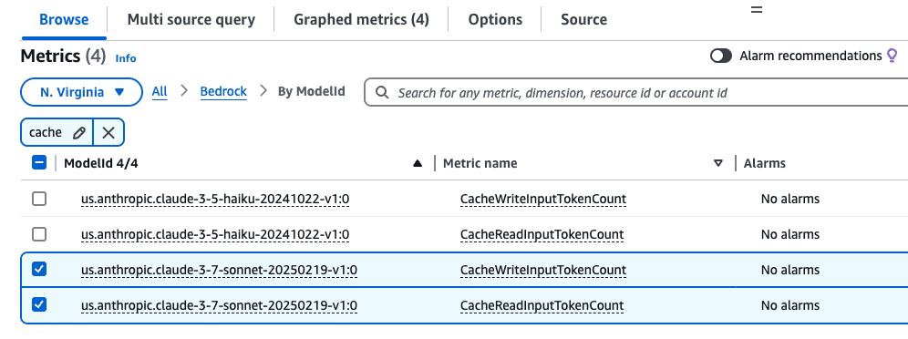 6. For the model, locate anthropic.claude-3-7-sonnet-20250219-v1:0, and select both CacheWriteInputTokenCount and CacheReadInputTokenCount.