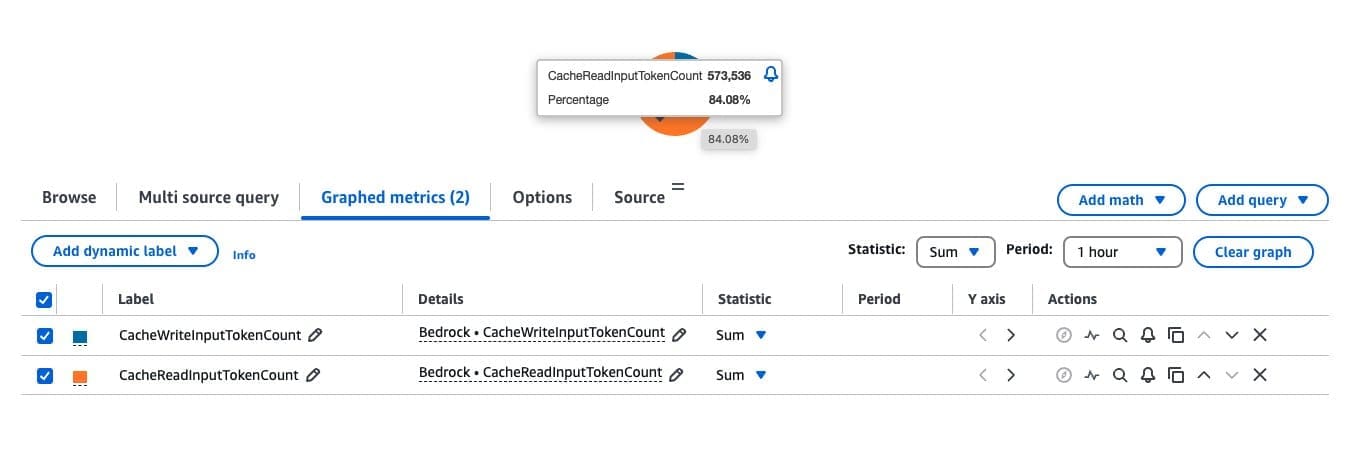 Analyzing cache hit rates involves observing both CacheReadInputTokens and CacheWriteInputTokens. By summing these metrics over a defined period, developers can gain insights into the efficiency of the caching strategies. With the published pricing for the model-specific price per 1,000 input tokens (cache write) and price per 1,000 input tokens (cache read) on the Amazon Bedrock pricing page, you can estimate the potential cost savings for your specific use case.
