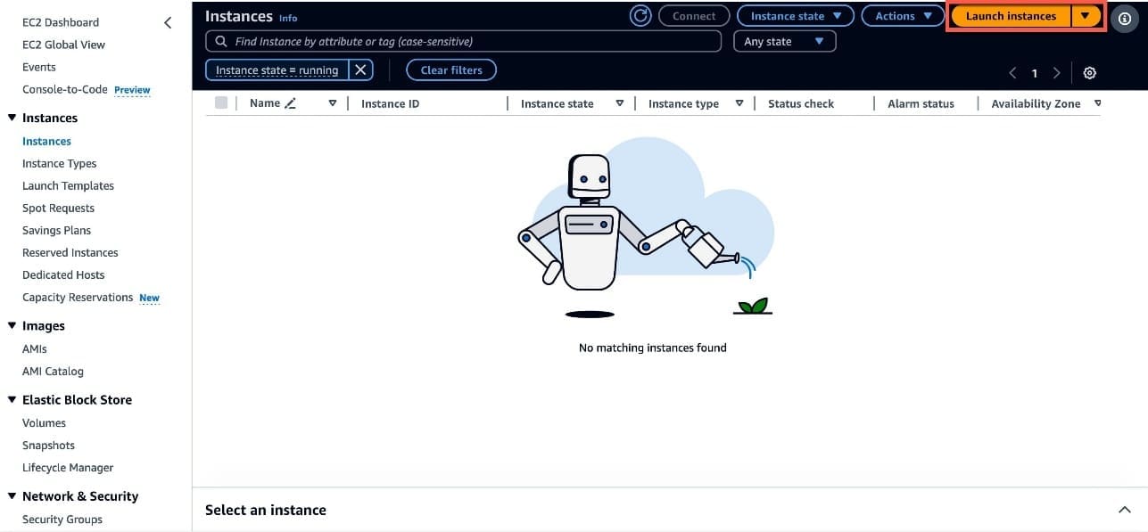 - On the Amazon EC2 console, choose Launch instances, as shown in the following screenshot.