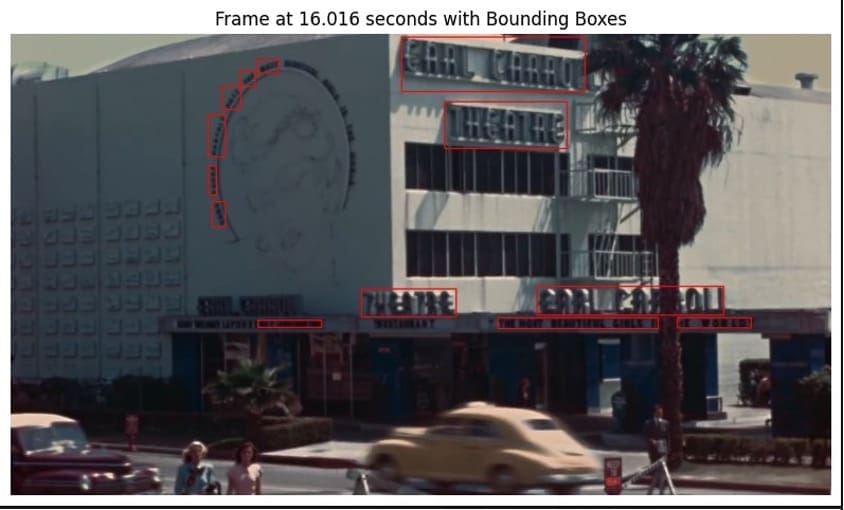 At a more granular level, BDA provides frame-accurate timestamps for shot boundaries. The system also performs text detection and logo detection on individual frames, generating bounding boxes around detected text and logo along with confidence scores for each detection. The following image is an example of text bounding boxes extracted from the Meridian video.
