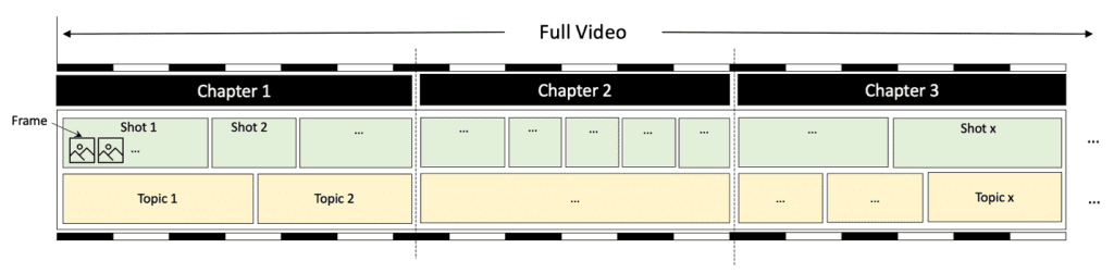 - Chapter – A sequence of shots that forms a coherent unit of action or narrative within the video, or a continuous conversation topic. BDA determines chapter boundaries by first classifying the video as either visually heavy (such as movies or episodic content) or audio heavy (such as news or presentations). Based on this classification, it then decides whether to establish boundaries using visual-based shot sequences or audio-based conversation topics.