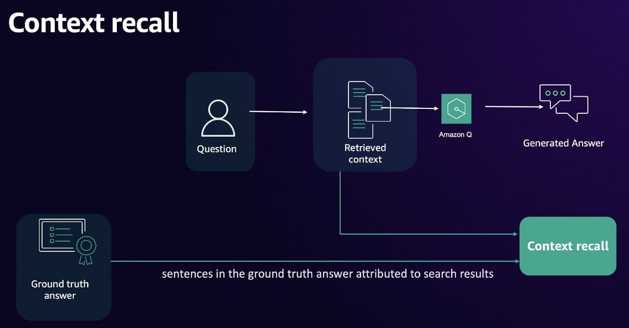 • Context recall – Measures how many of the relevant documents (or pieces of information) were successfully retrieved. It focuses on not missing important results. Higher recall means fewer relevant documents were left out.