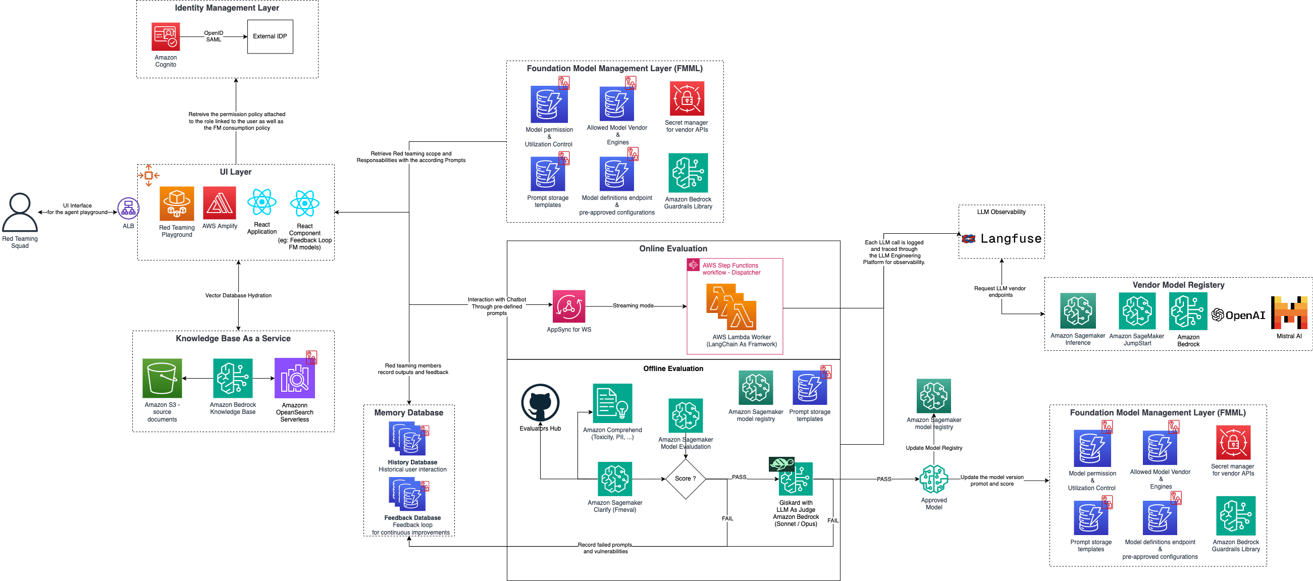 At the outset, the Identity Management Layer handles secure authentication, using Amazon Cognito and integration with external identity providers to help secure authorized access. Post-authentication, users access the UI Layer, a gateway to the Red Teaming Playground built on AWS Amplify and React. This UI directs traffic through an Application Load Balancer (ALB), facilitating seamless user interactions and allowing red team members to explore, interact, and stress-test models in real time. For knowledge retrieval, we use Amazon Bedrock Knowledge Bases, which integrates with Amazon Simple Storage Service (Amazon S3) for document storage, and Amazon OpenSearch Serverless for rapid and scalable search capabilities.