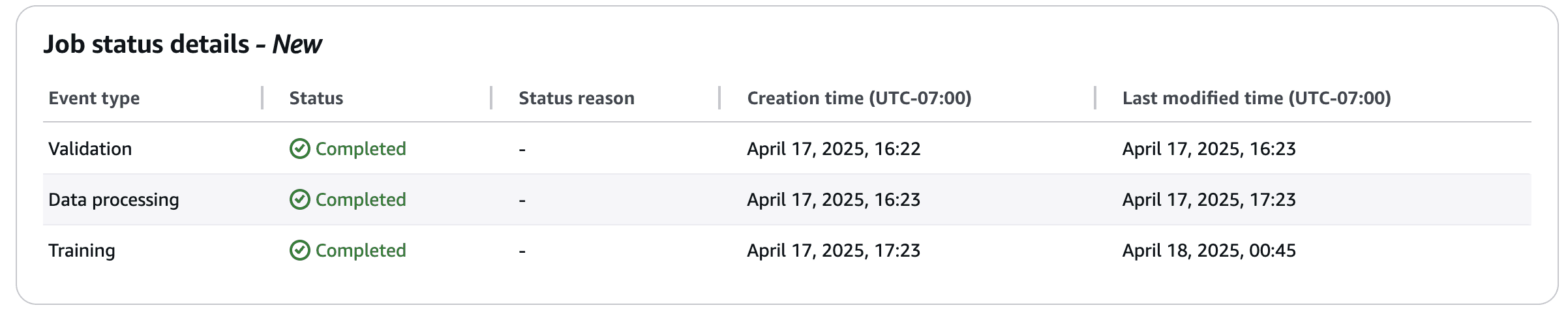 Amazon Bedrock Model Distillation also offers enhanced training job status reporting to provide more detailed information about where your model distillation job stands in the process. Rather than brief status indicators such as “In Progress” or “Complete,” the system now provides more granular status updates, helping you better track the progress of the distillation job.